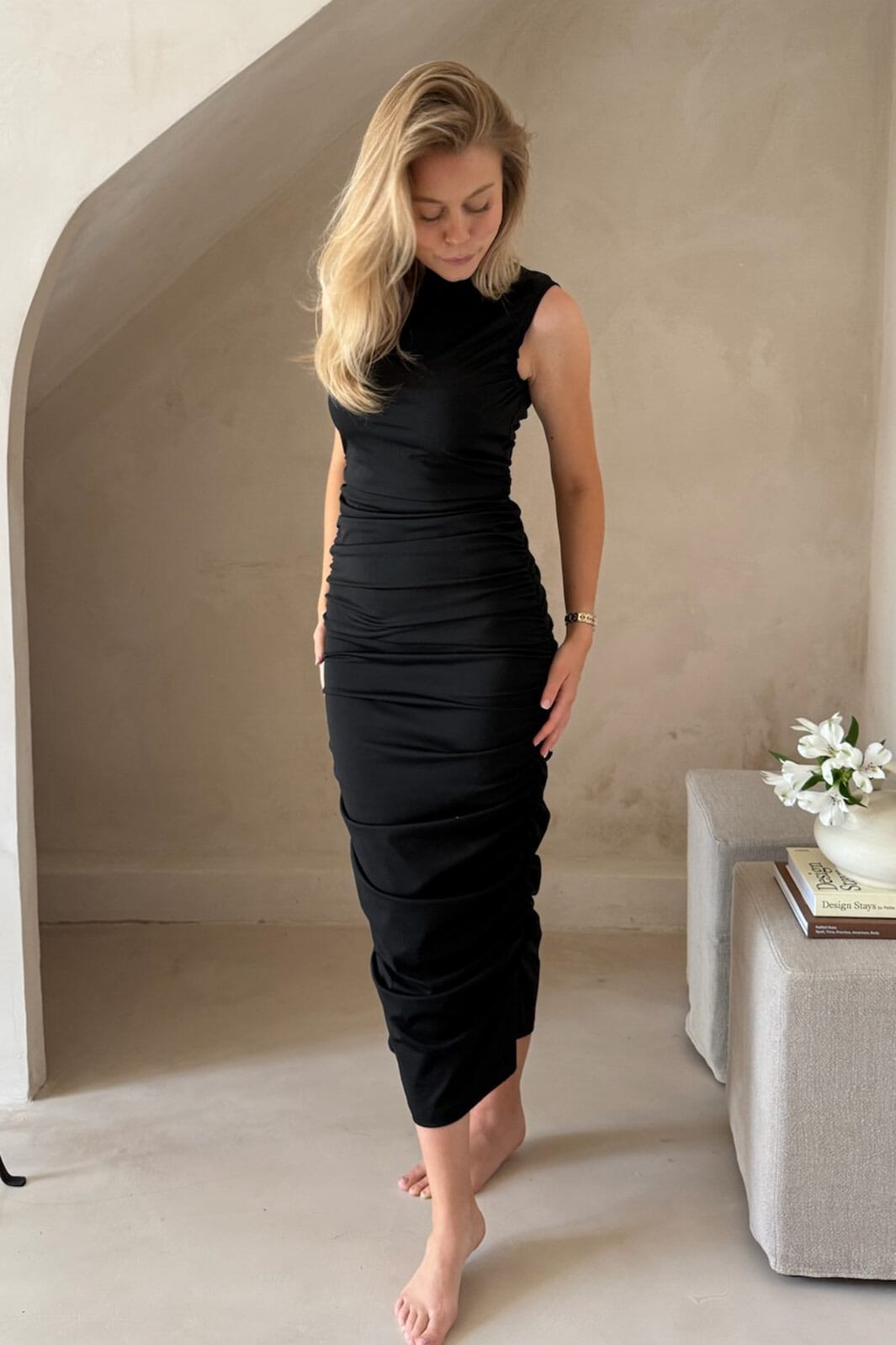 Zwarte jurk van BYIC met een hoge hals en een aansluitende pasvorm. De jurk heeft geplooide details langs de zijkanten en komt tot halverwege de kuit.