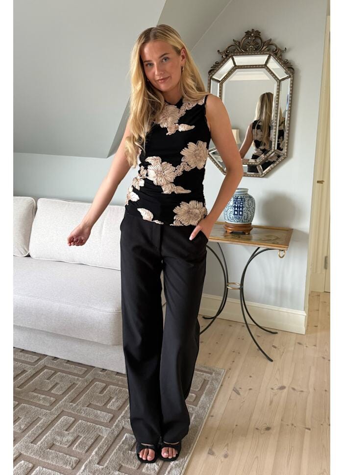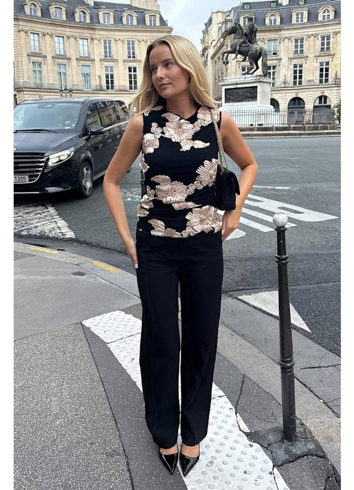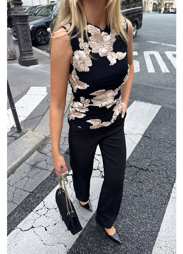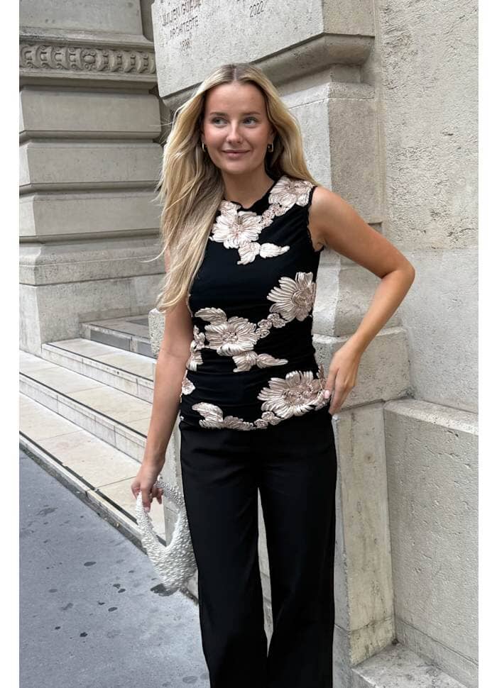 Zwarte mesh-top van BYIC met geborduurde bloemen in beige. De top heeft 3D-bloemendetails en ruches bij de schouders, wat een uniek ontwerp creëert met plooidetails aan de zijkanten.
