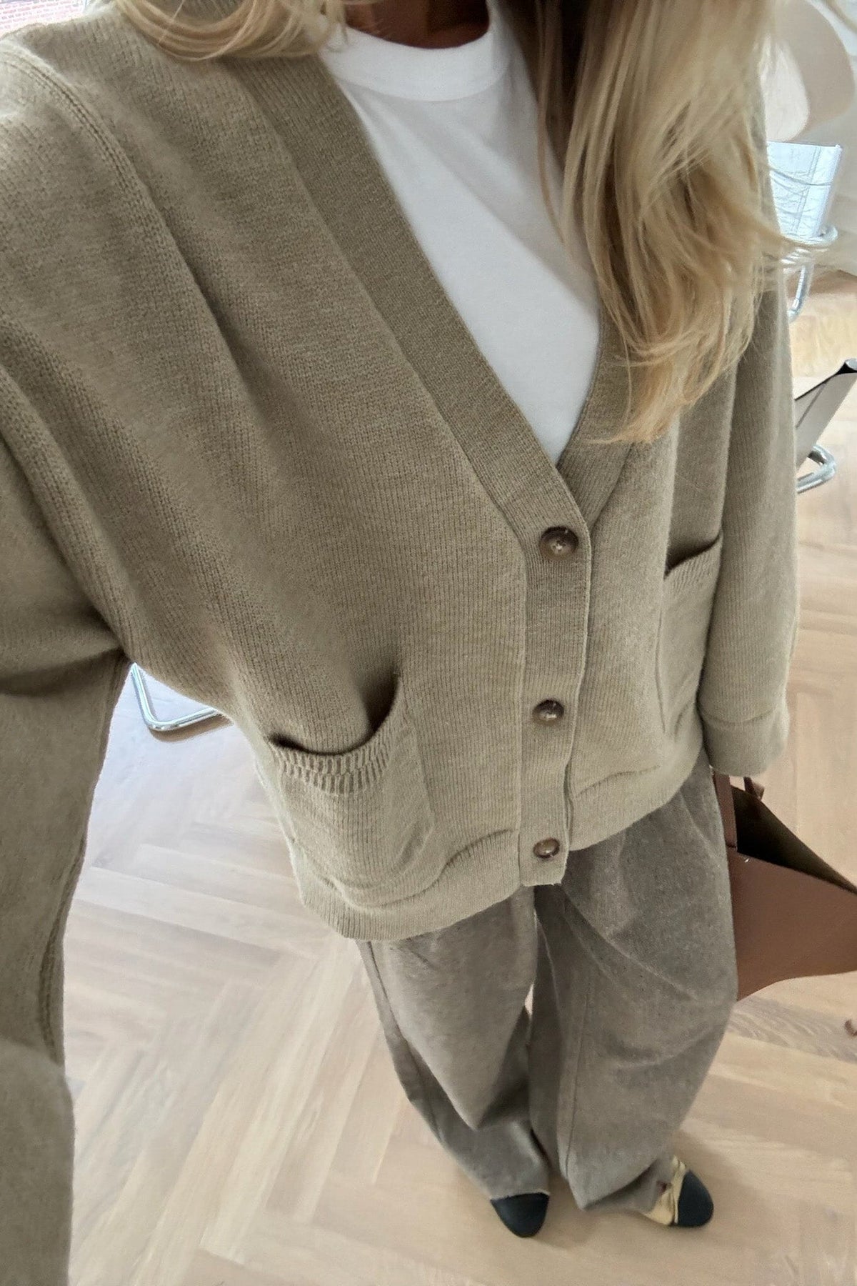 Beige cardigan van BYIC in brei met brede mouwen en V-hals. De cardigan heeft zichtbare knopen en twee zakken aan de voorkant. De eenvoudige stijl maakt het gemakkelijk om te combineren met andere kleding.