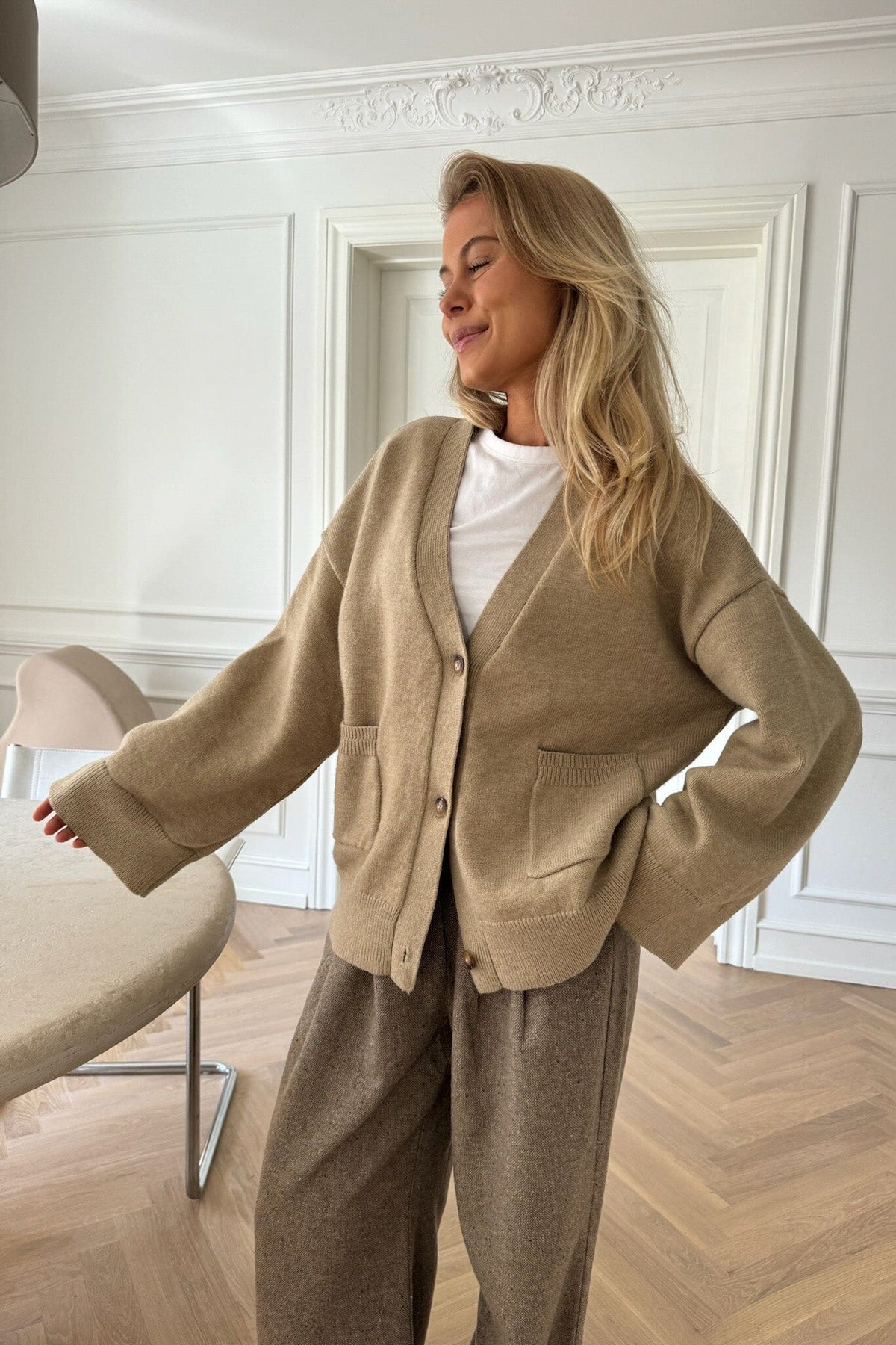 Beige cardigan van BYIC in brei met brede mouwen en V-hals. De cardigan heeft zichtbare knopen en twee zakken aan de voorkant. De eenvoudige stijl maakt het gemakkelijk om te combineren met andere kleding.