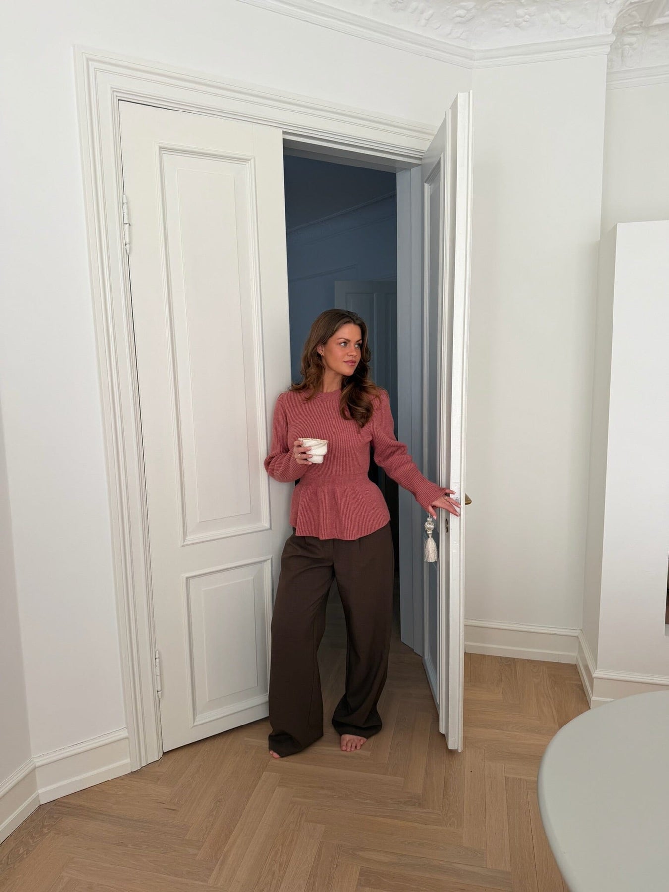 Een roze trui van BYIC met peplum-effect in de taille. De trui heeft een ribgebreide textuur en een slim fit-pasvorm.