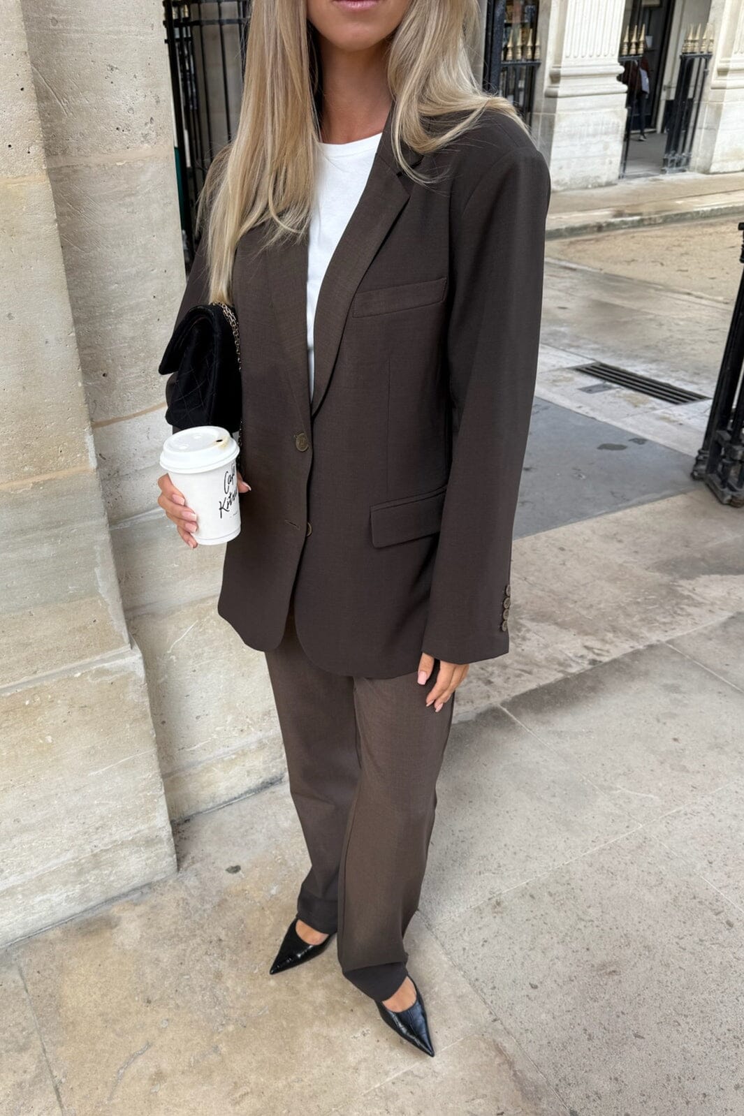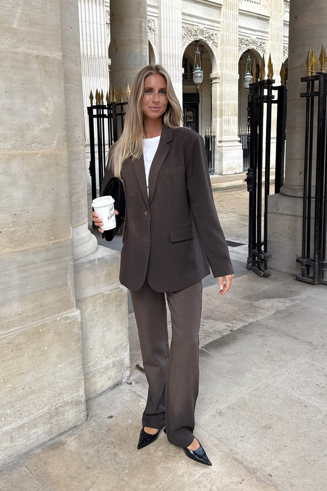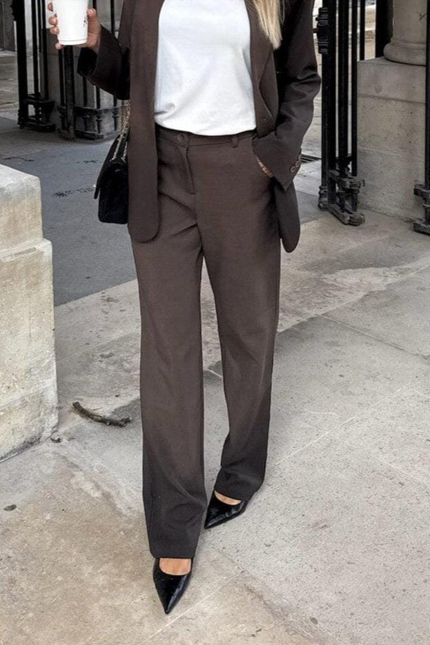 Donkerbruine broek van BYIC met een rechte snit en hoge taille. De broek heeft riemlussen in de taille en een knoop- en ritssluiting aan de voorkant.