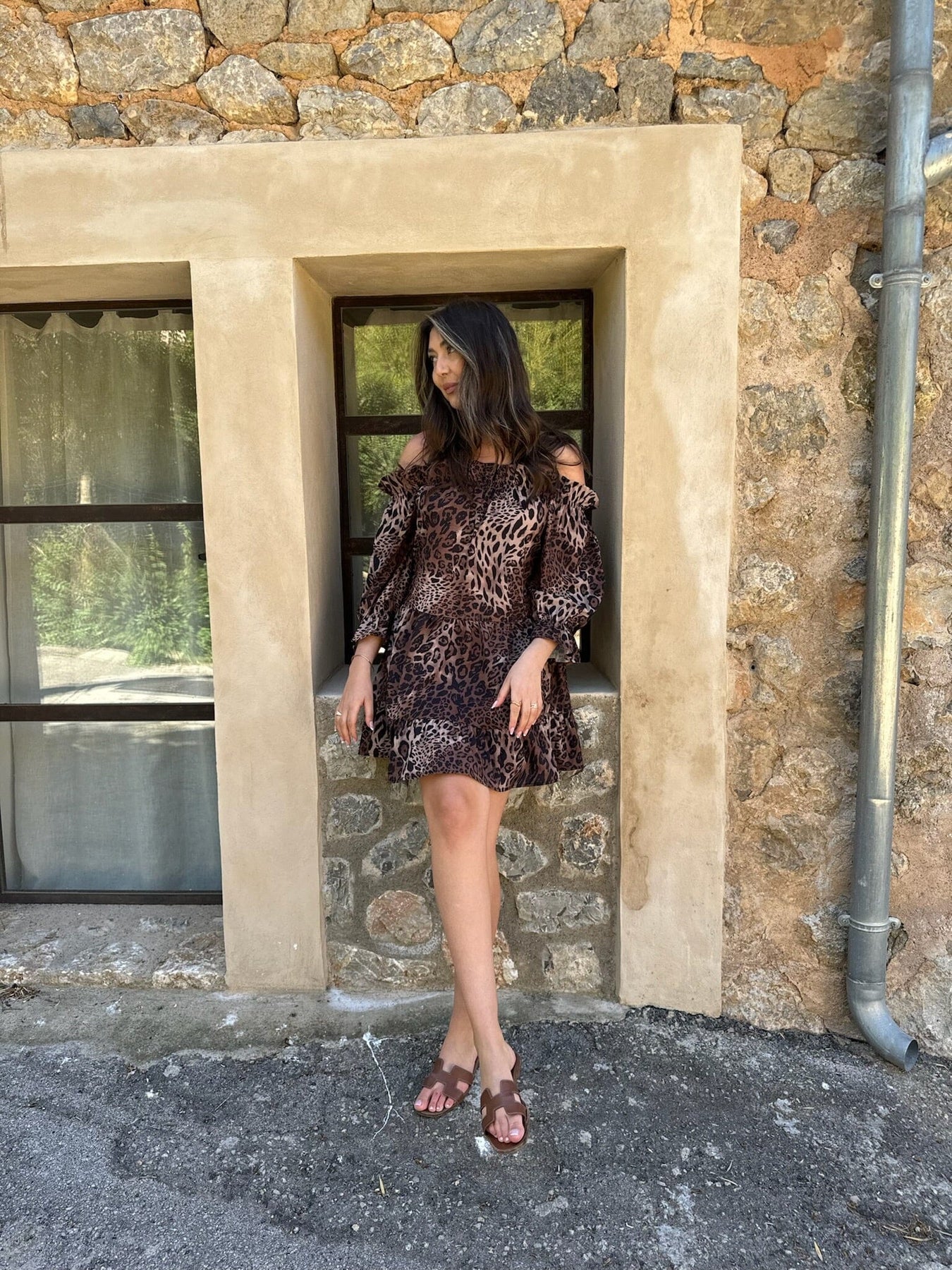 Off-shoulder jurk van BYIC in bruin luipaardprint. Het heeft korte mouwen met ruches en een ingenaaid onderjurk. Het ontwerp van de jurk combineert een ontspannen snit met fijne details.