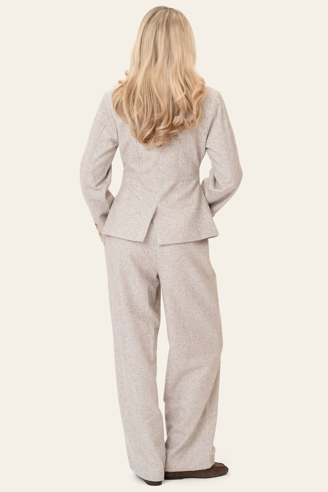 Beige blazer van BYIC van gestructureerde stof met een aansluitende taille. De blazer heeft een overhemdkraag, knopen in natuurtinten en twee klepzakken.