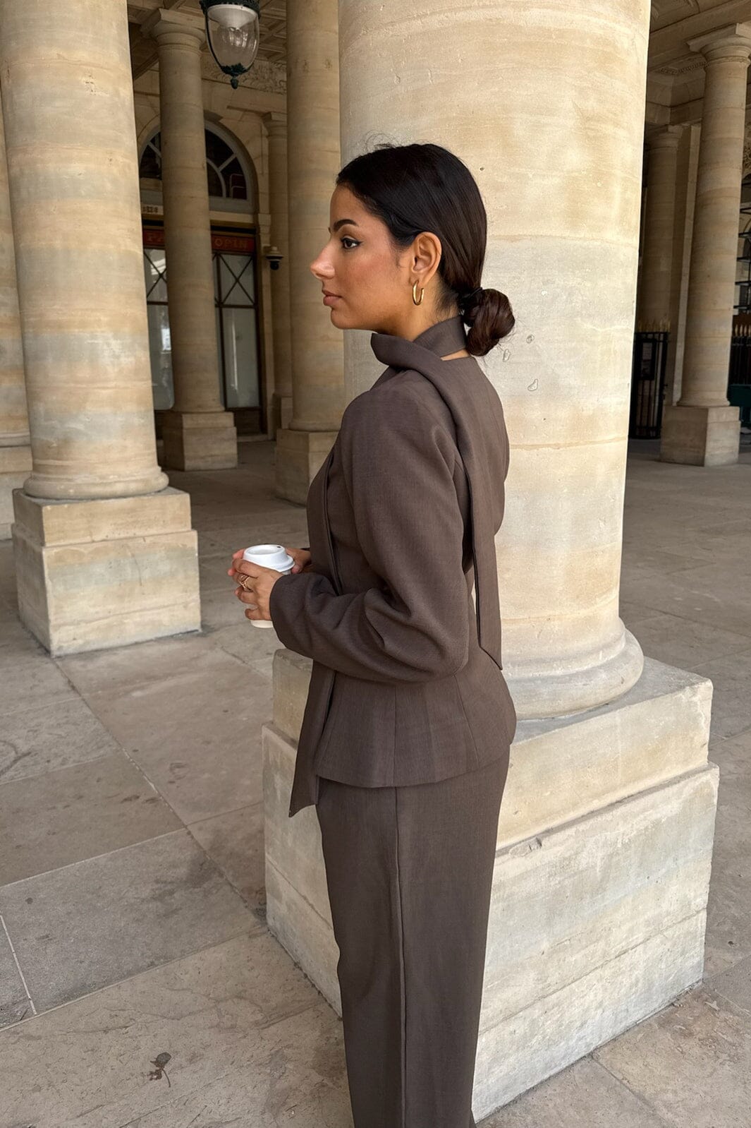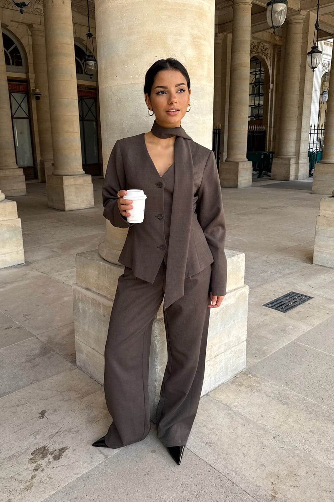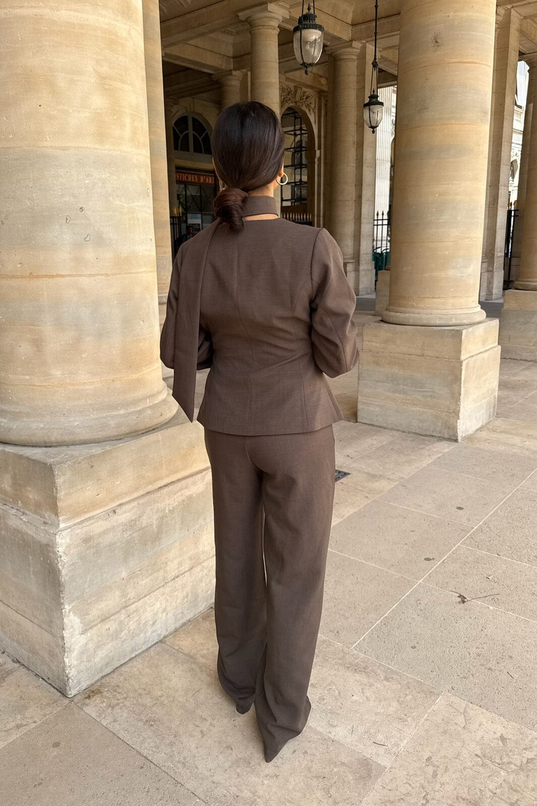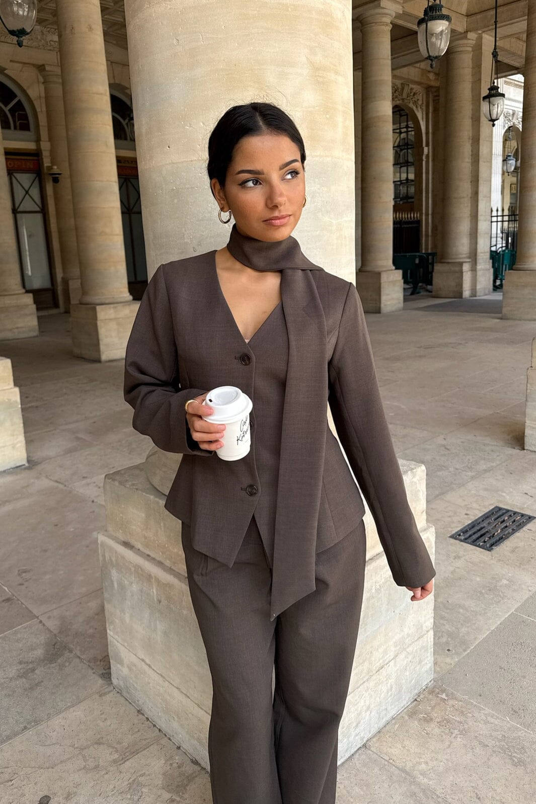 Donkerbruine blazer van BYIC met een V-hals en een slim fit pasvorm. De blazer heeft een strikriem die je in de taille kunt dragen of als sjaal, en sluit met donkerbruine knopen aan de voorkant.