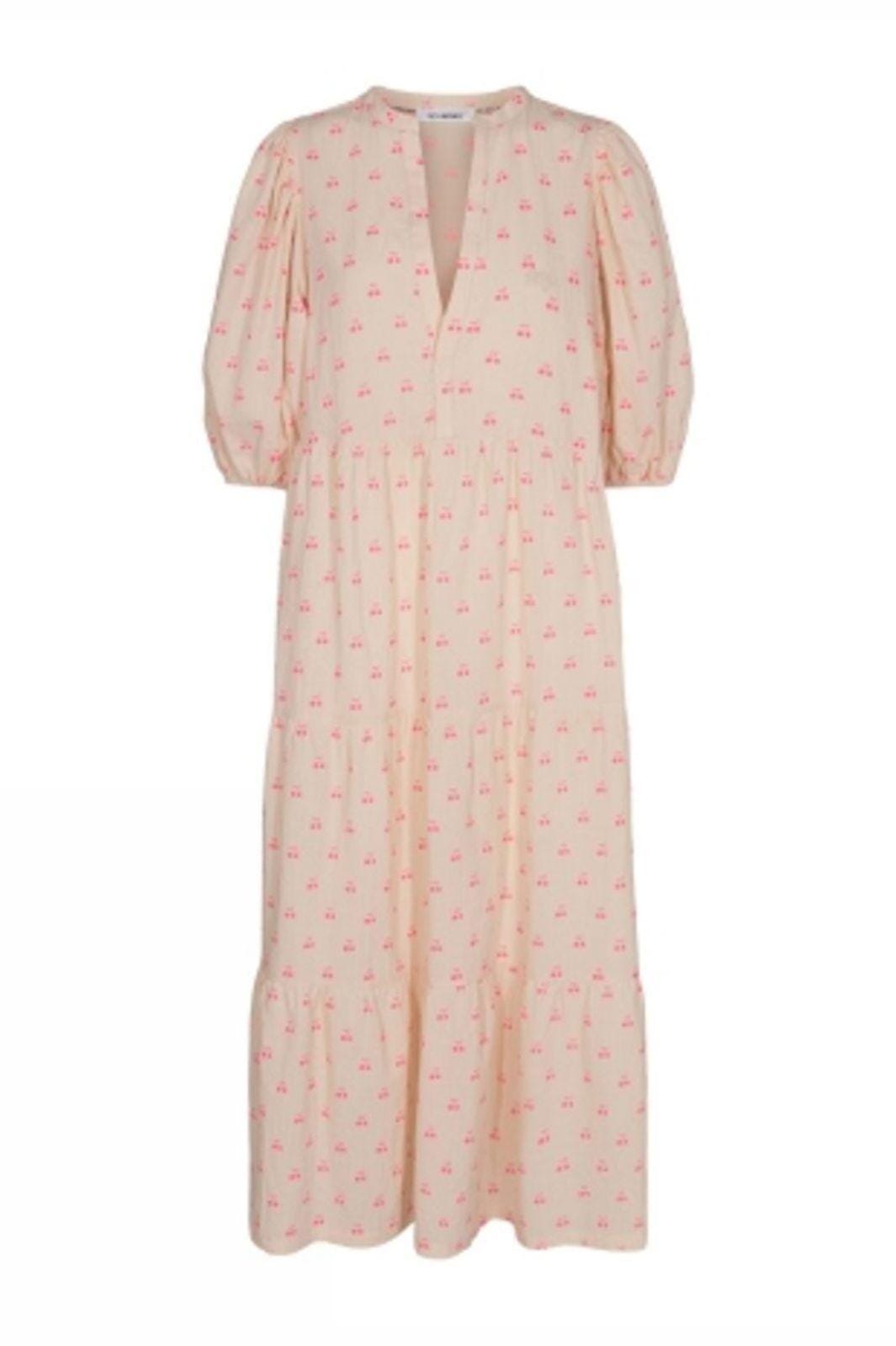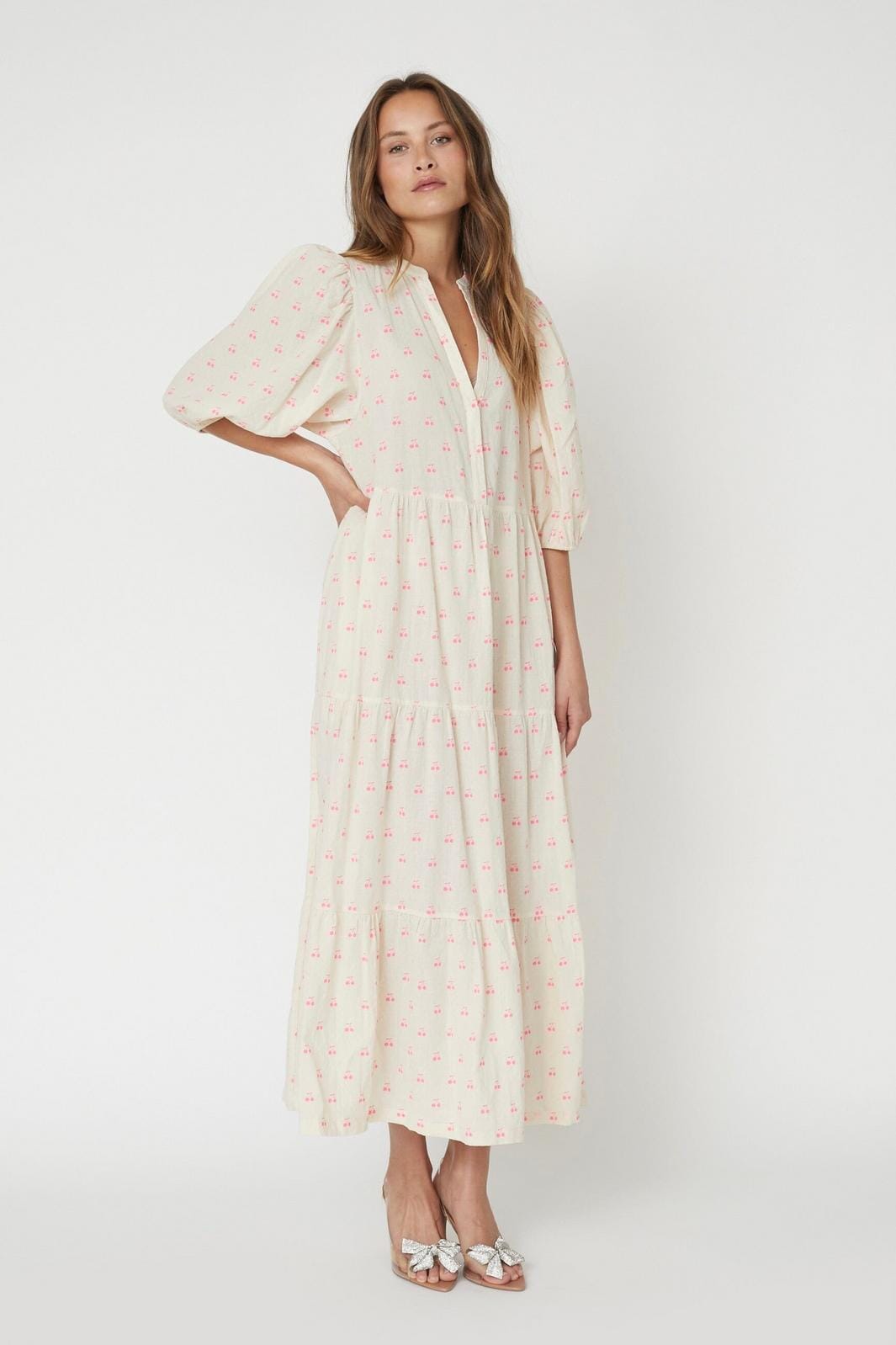 Vloerlange jurk van Co'Couture met een beige basis en neonroze kersenpatroon. De jurk heeft een V-hals met ruches en 3/4 pofmouwen.