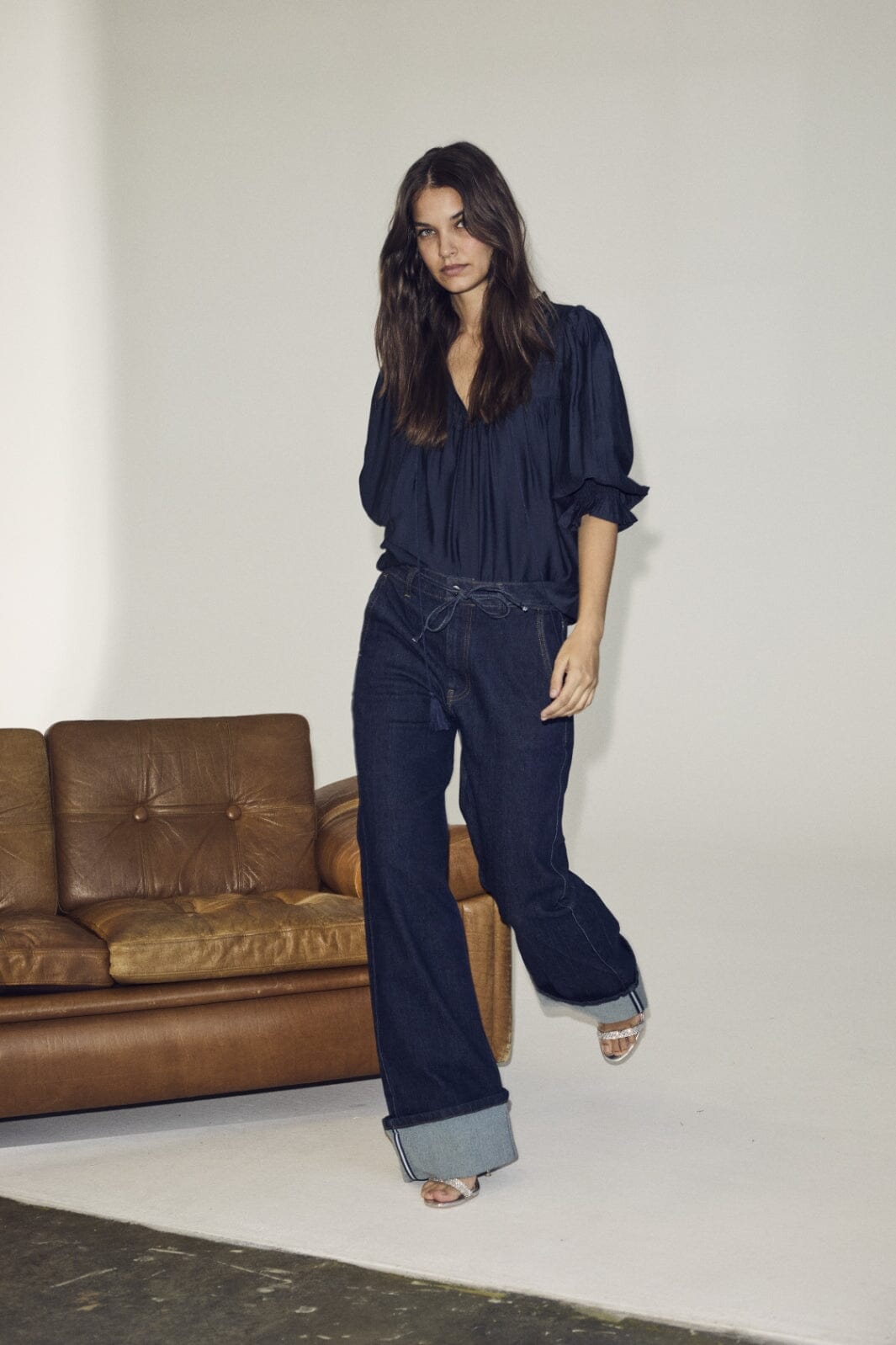 Donkerblau blouse van Co´couture met pofmouwen en kantdetails. De blouse heeft een V-hals en een striksluiting met kwastjes, wat zorgt voor een lichte en luchtige uitstraling.