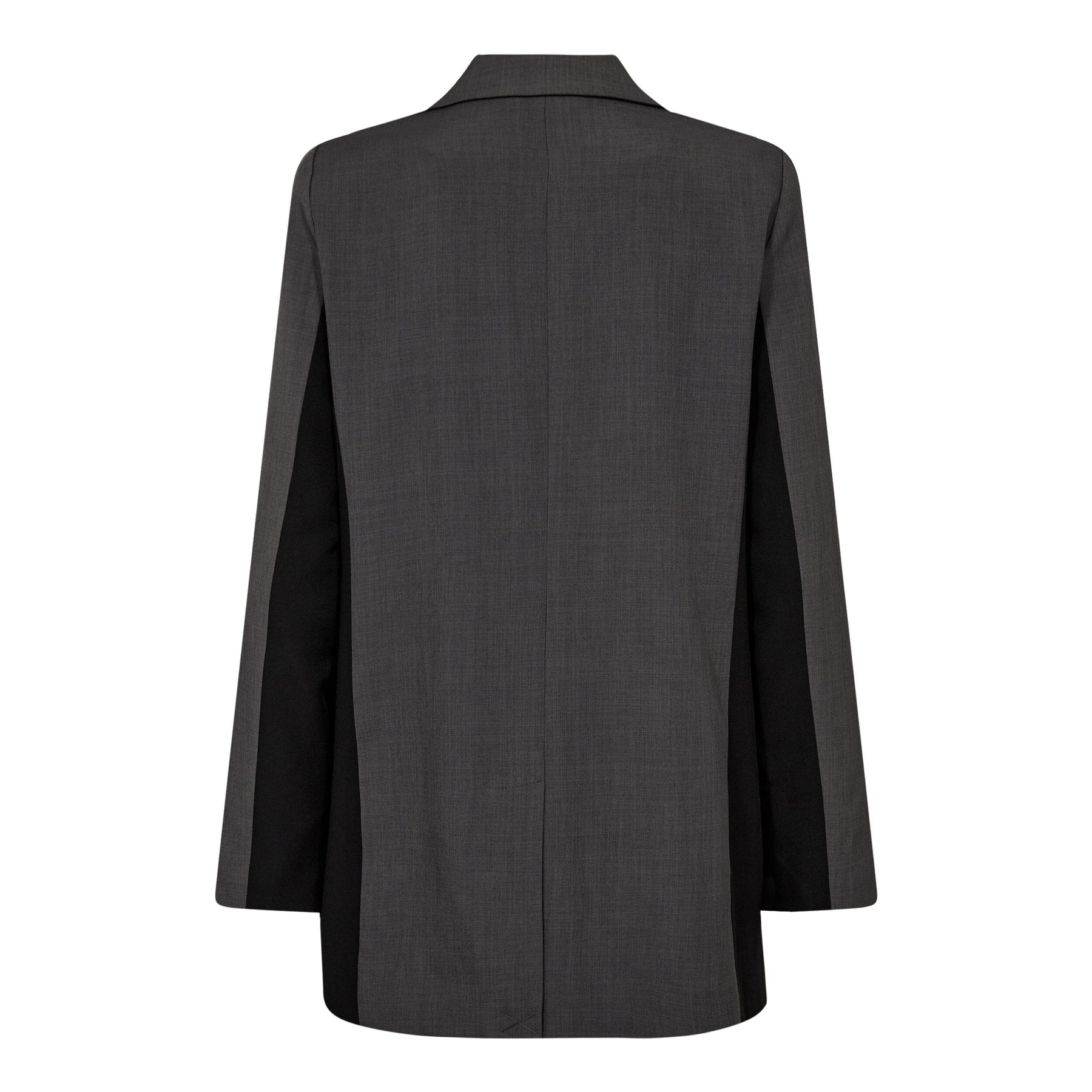 Donkergrijze blazer met zwart contrastpaneel aan de zijkanten. De oversized blazer heeft een overhemdkraag en lange mouwen. Het ontwerp combineert klassieke blazerdetails met moderne elementen.