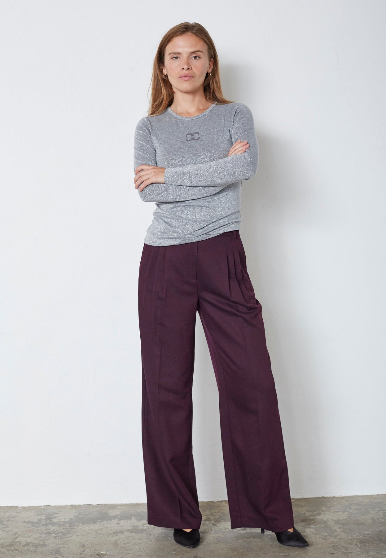 Zilverkleurig lang mouw T-shirt van Co'Couture met borduursel op de borst. De T-shirt heeft een ronde hals en een glanzende uitstraling door de metalen draden in de stof.