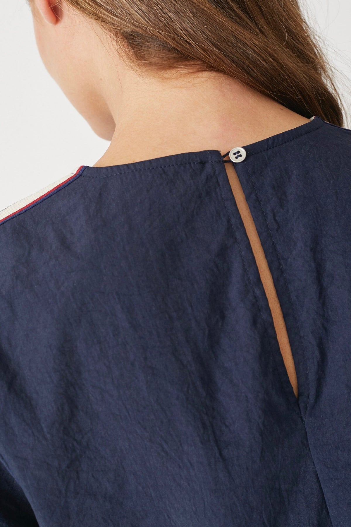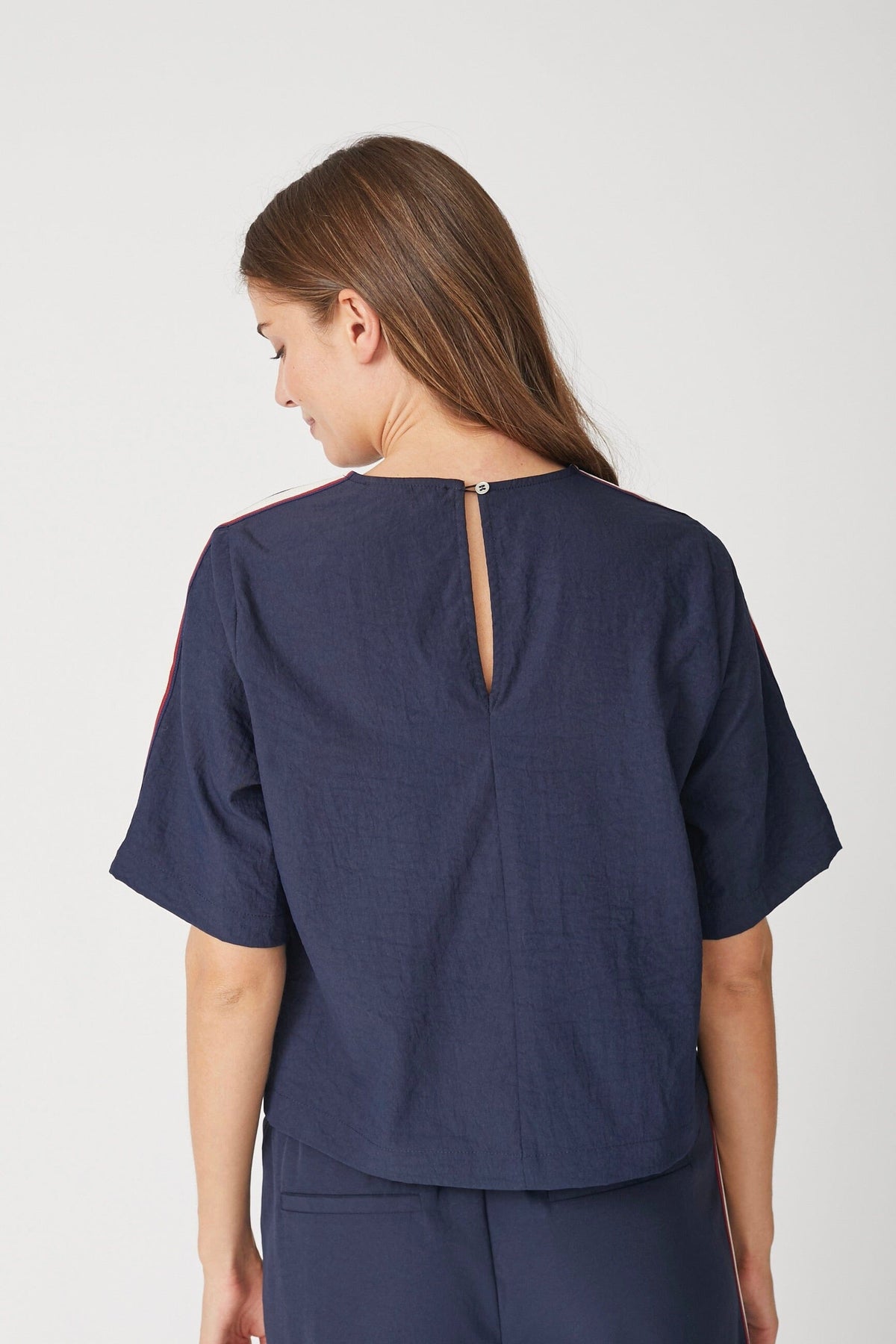 Donkerblau blouse van Co´Couture met strepen op de mouwen in rood en beige. Het heeft een ronde halslijn en korte, brede mouwen met een knoopsluiting aan de achterkant.