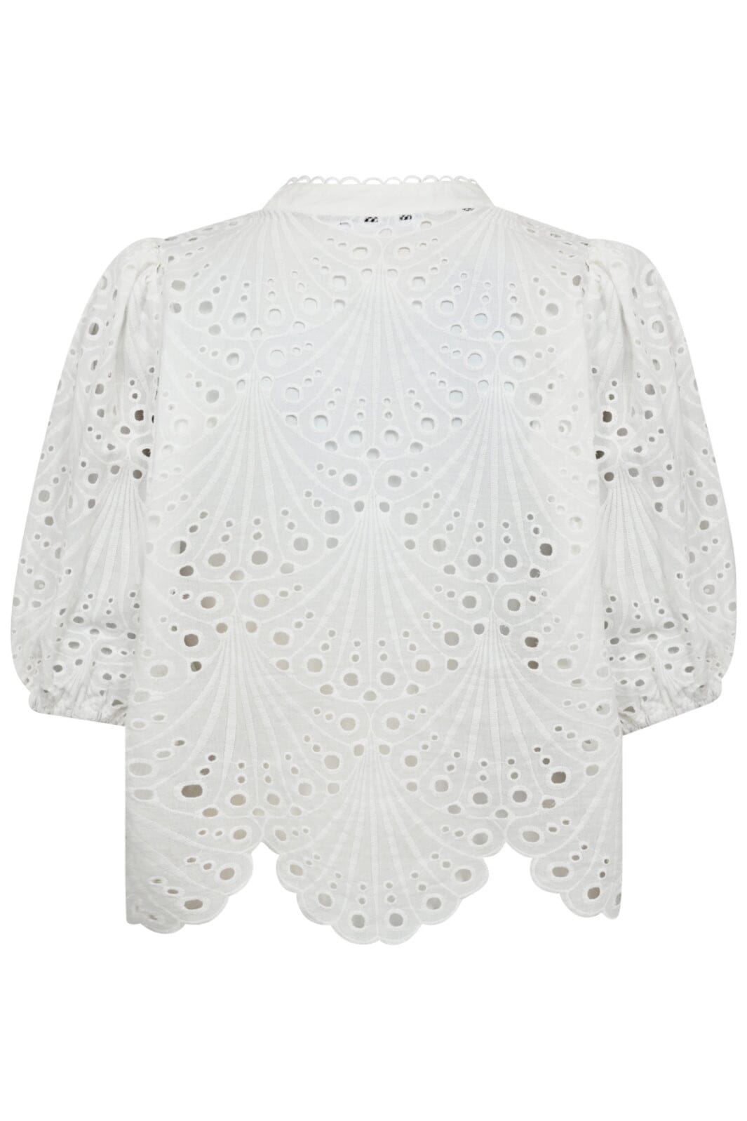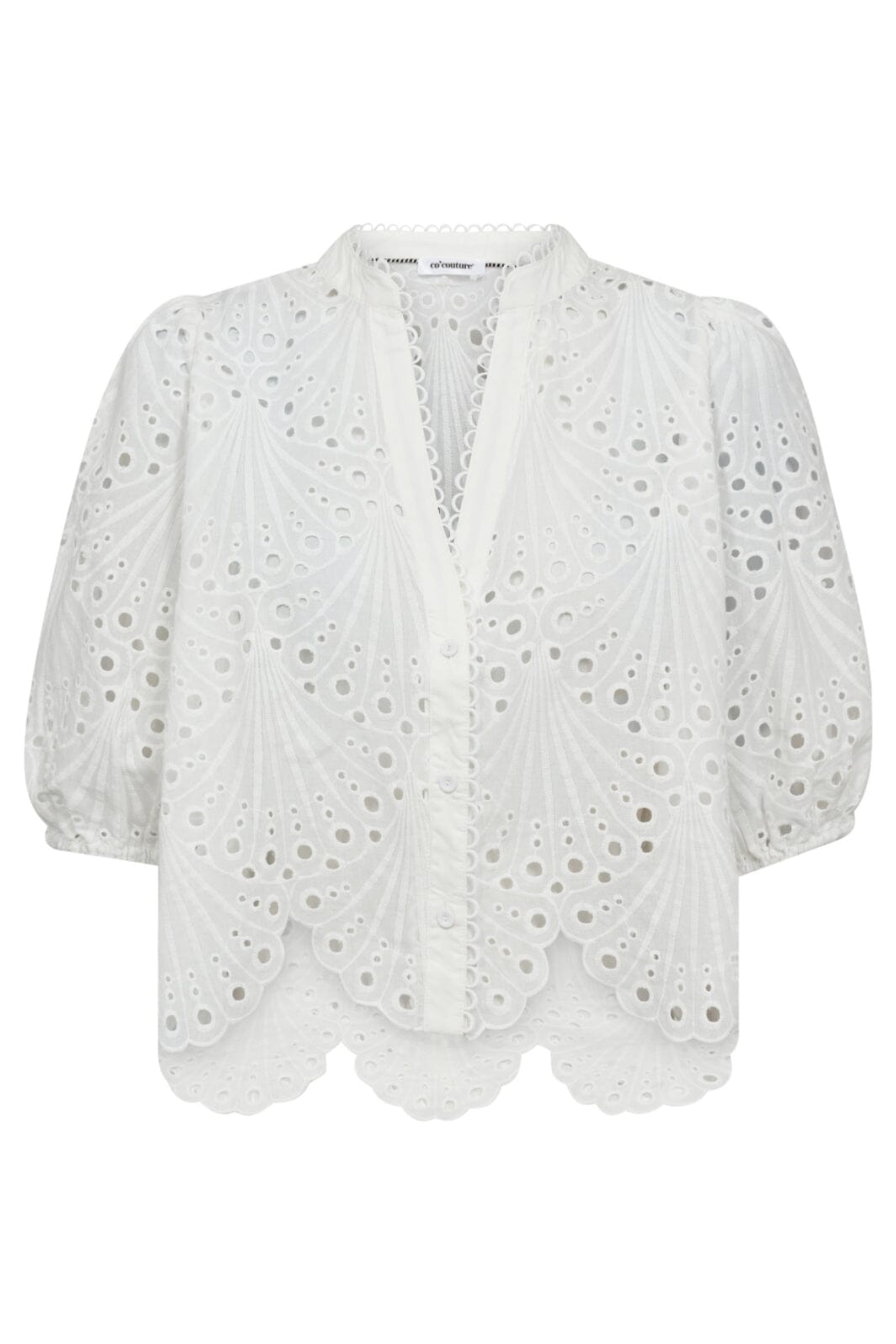 Witte blouse van Co´Couture met borduursel en korte mouwen. De blouse heeft puffmouwen met een verzamelde manchet, een ronde hals en een knoopsluiting aan de voorkant met een decoratieve scalloprand.