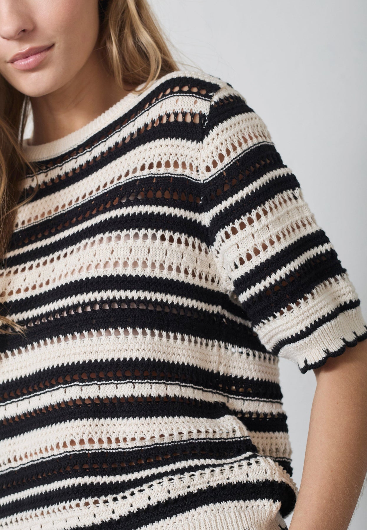 Gestreepte trui van Co´Couture, gemaakt van 100% biologisch katoen in een offwhite en zwarte combinatie met een ajourstructuur.