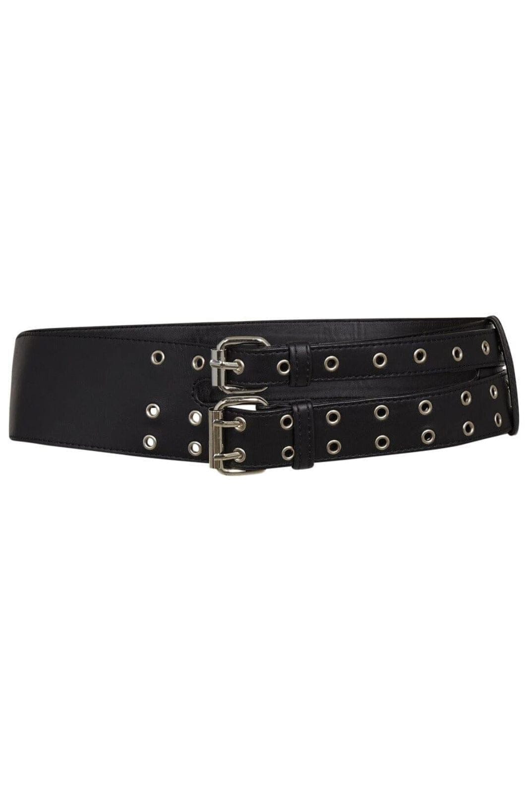 Zwarte riem van Co'Couture met dubbele gesp en metalen oogjes. De riem is gemaakt van leer met een breed design en heeft twee rijen oogjes langs de rand.