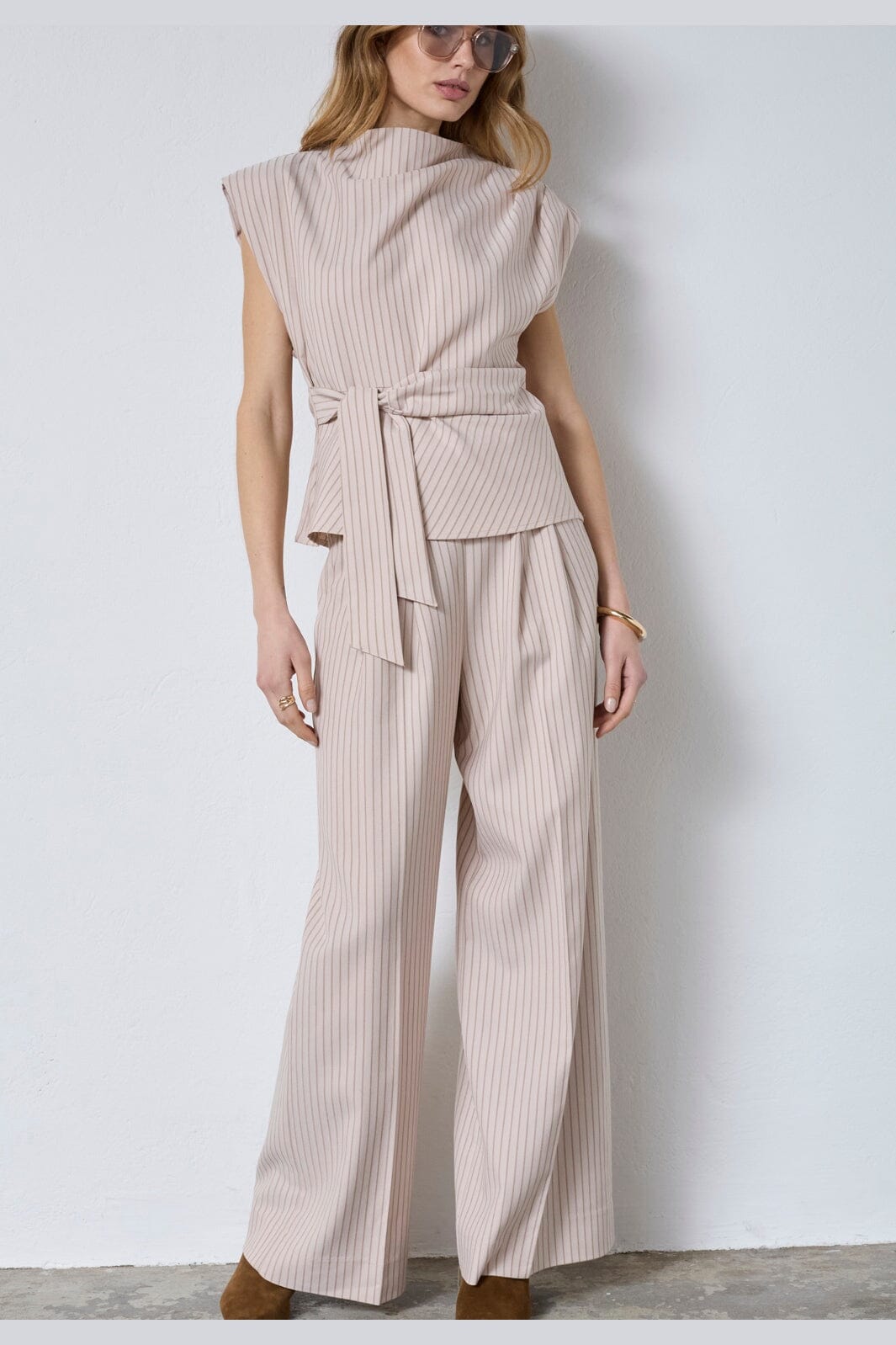 Mouwloze top van Co´Couture met verticale strepen in een licht beige tint. De top heeft een hoge halslijn en een strikceintuur in de taille.