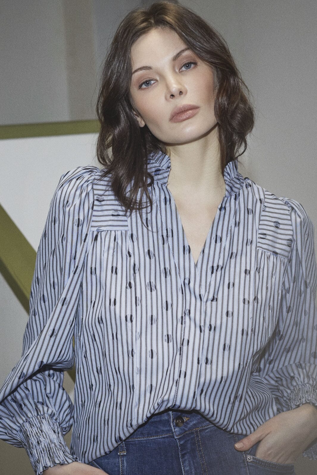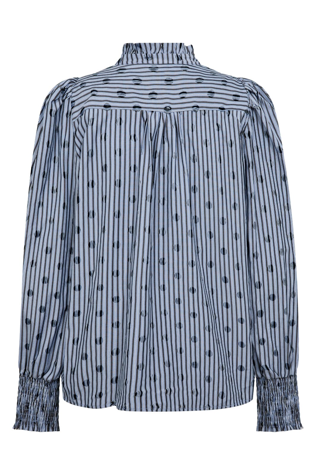 Blauwe blouse van Co´Couture met strepen en stippen. De blouse heeft een gerimpelde kraag met ruches en lange mouwen met ruchesdetails.