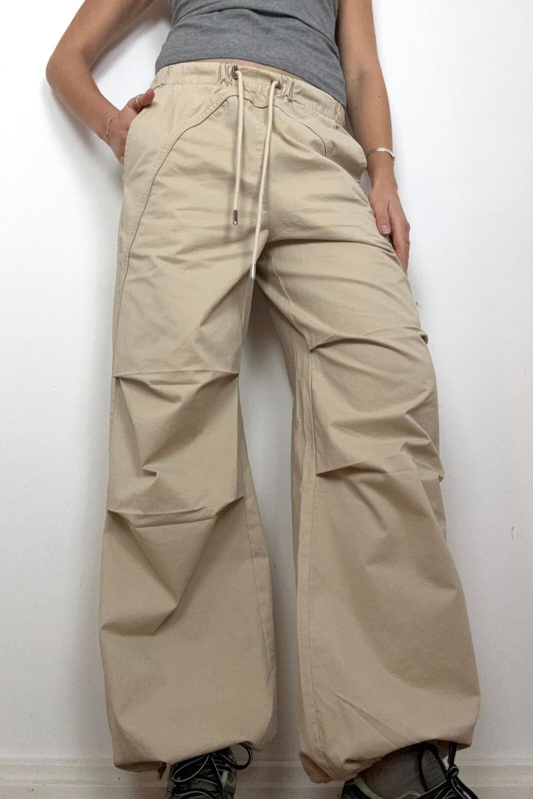 Beige broek van Continue in een zandkleurige tint. De broek heeft een losse pasvorm met decoratieve stiksels en een trekkoorddetail in de taille.