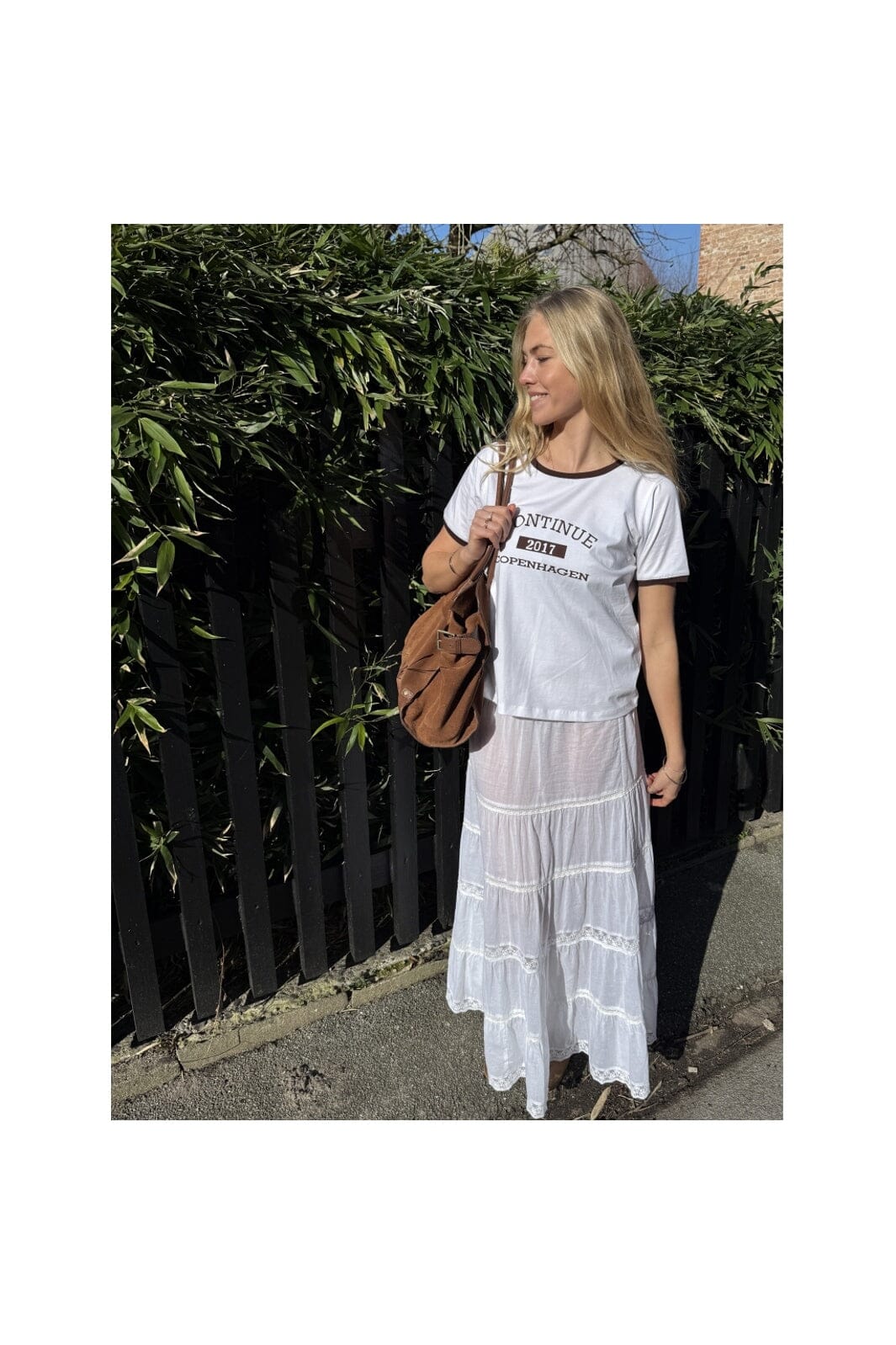 Wit T-shirt van Continue met bruine boorden langs de hals en mouwen. Gemaakt van katoen met decoratieve stiksels en print.