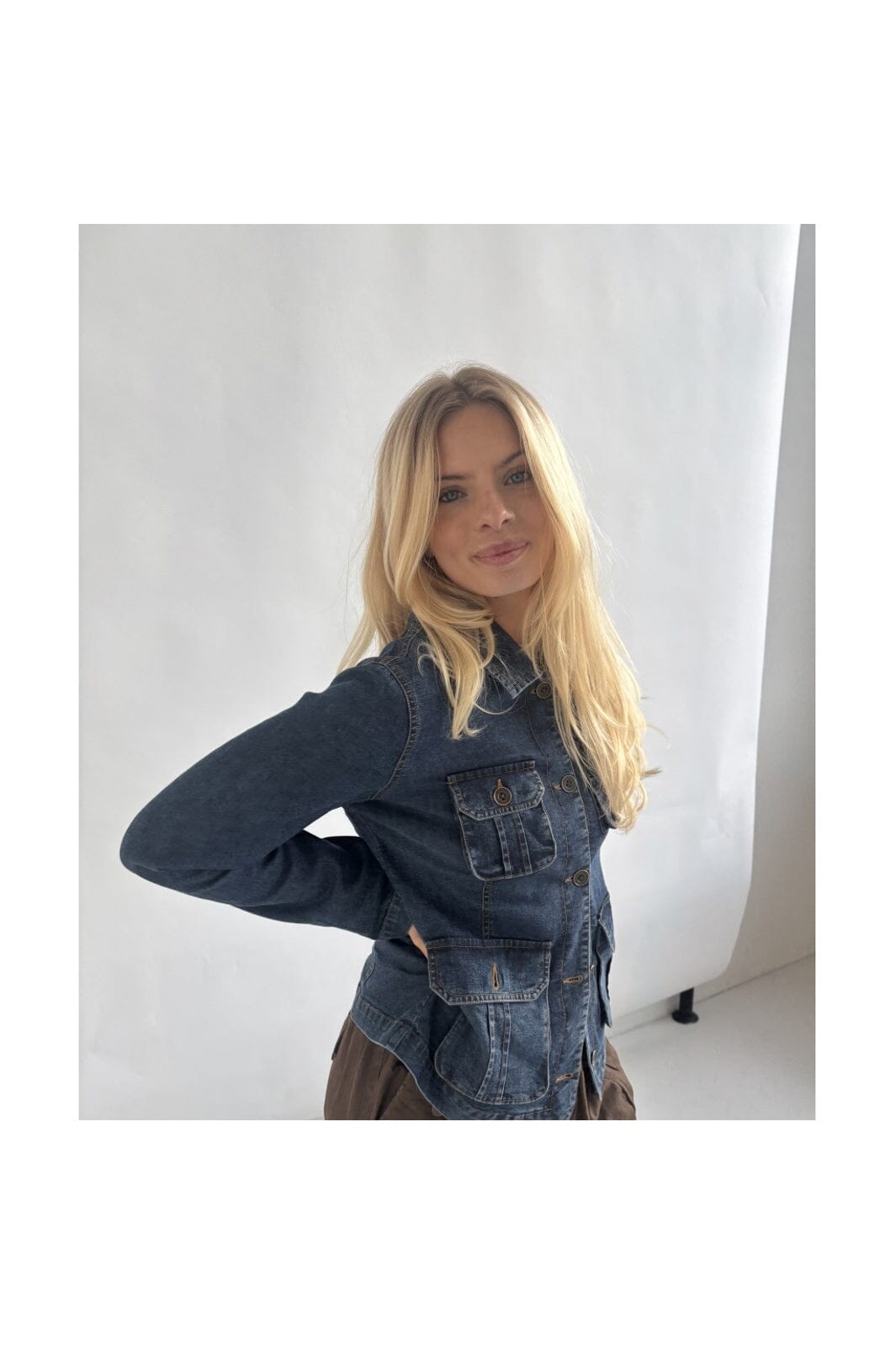 Denimjack van Continue in blauwe denim. Het jack heeft meerdere zakken aan de voorkant en een geborduurd detail op de achterkant.