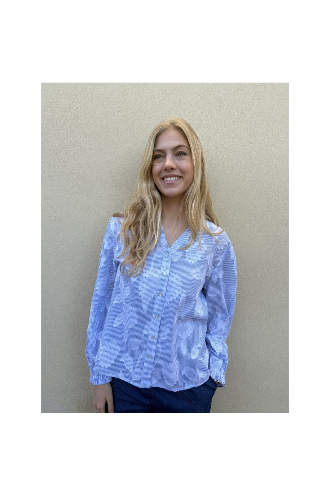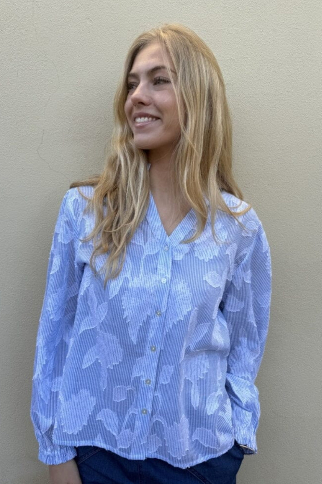 Blauwgestreepte blouse van Continue, gemaakt van 100% katoen. De blouse heeft wit bloemenborduursel op de blauwe strepen en ruches bij de schouders.