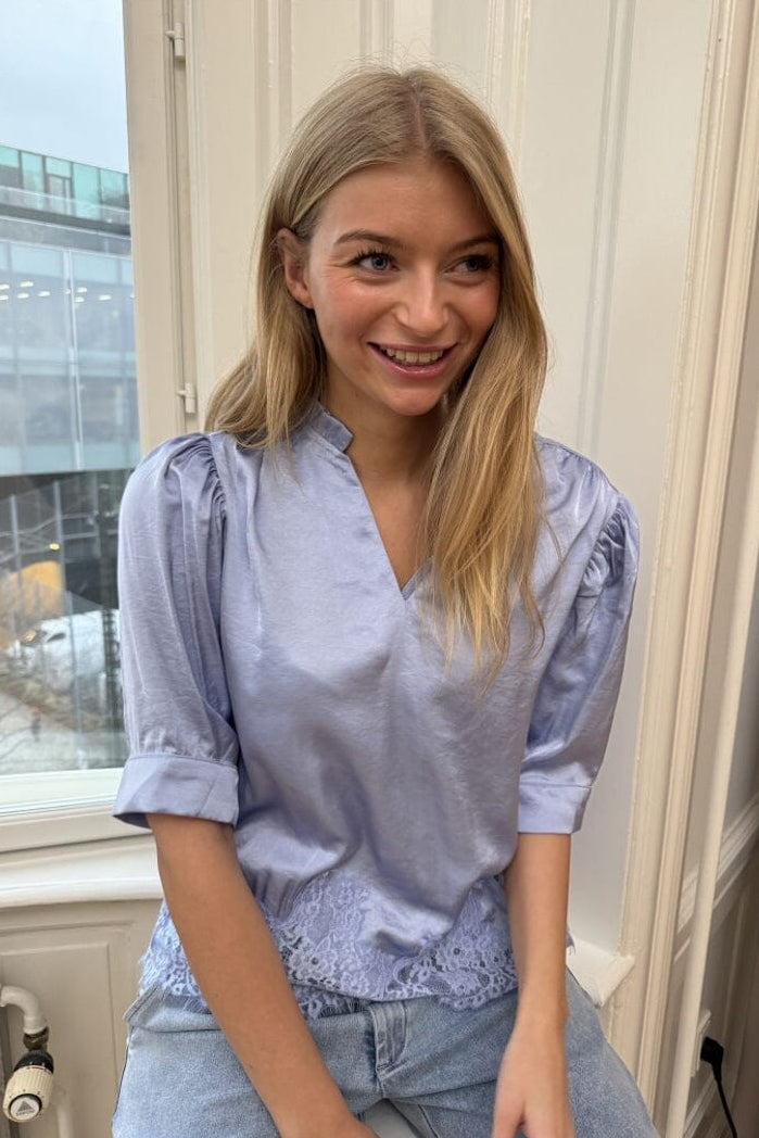 Lichtblauwe blouse van Continue, gemaakt van polyester en viscose. De blouse heeft een V-hals, 3/4-mouwen en kanten details aan de onderkant.