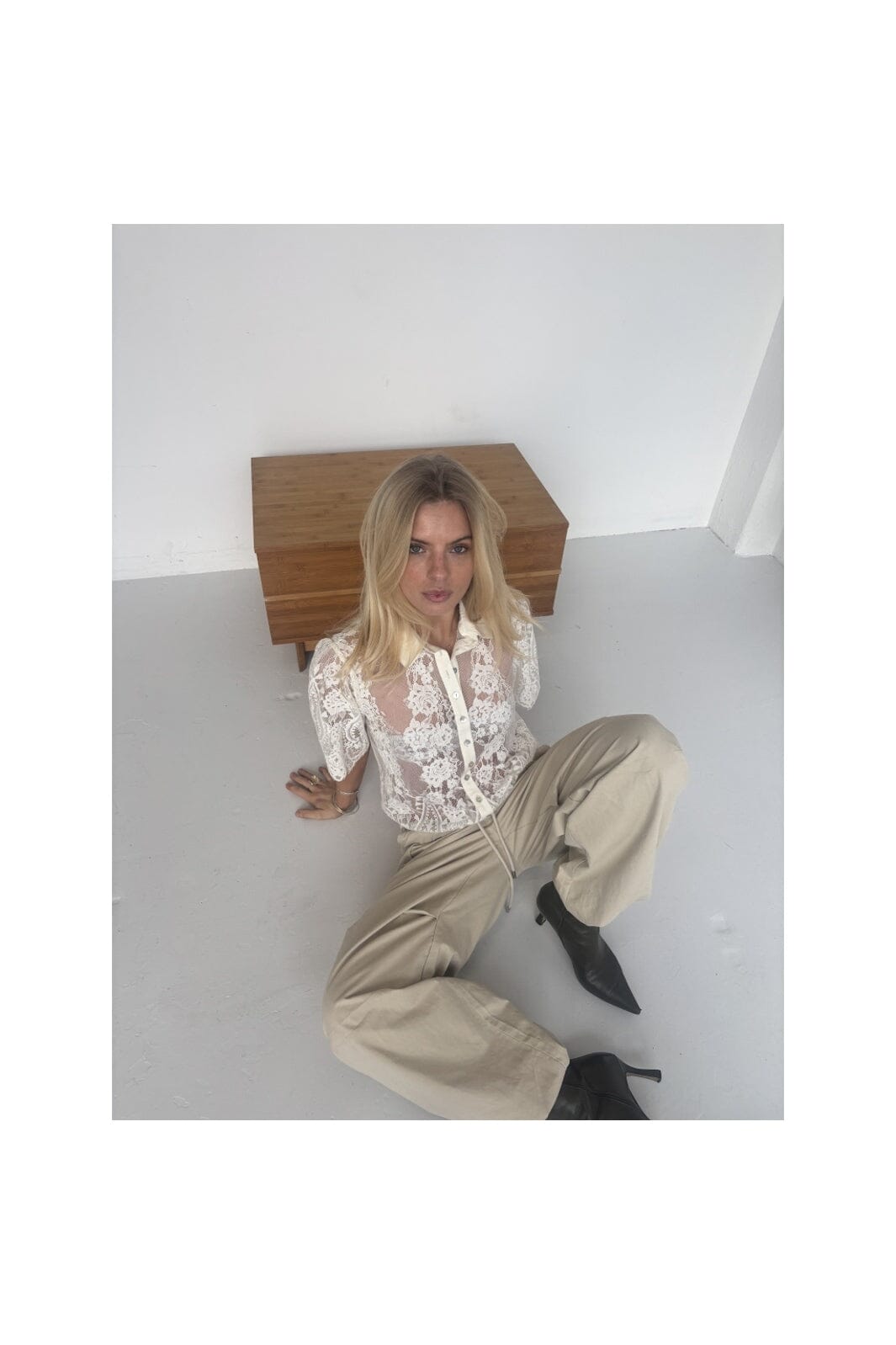 Kantentop van Continue in offwhite met een bloemachtig kantpatroon. De top heeft korte mouwen, een overhemdkraag en een knoopsluiting aan de voorkant.