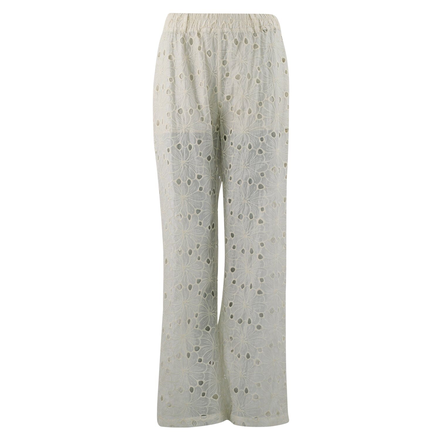 Lange jumpsuit van Continue in off-white kant met bloemenpatroon. Hij heeft korte mouwen, knoopsluiting aan de voorkant en een strikband in de taille die naar wens kan worden aangepast.