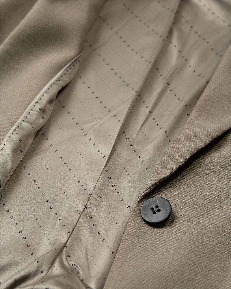 Op maat gemaakte blazer van Copenhagen Muse in een beige-groen gemêleerde kleur. Het jasje heeft brede schouders, een V-hals met revers en een voering met logopatroon. Hij is geschikt voor formele, casual en feestelijke gelegenheden.