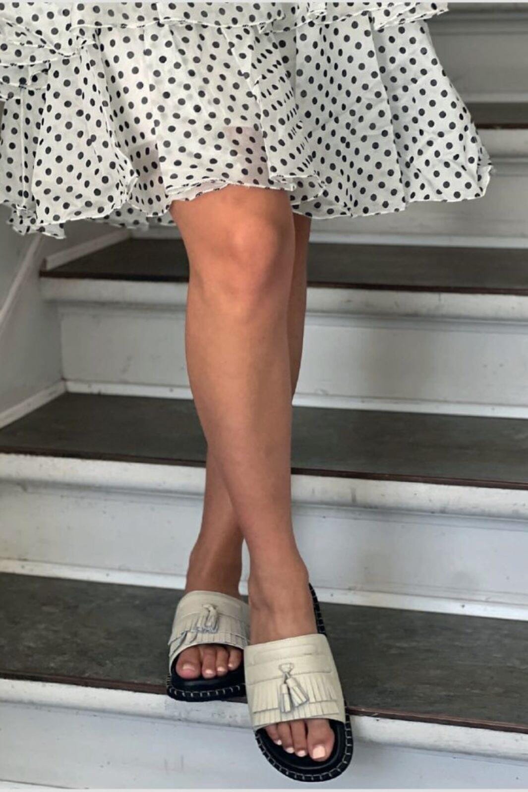 Open sandalen van Copenhagen Shoes van leer/suède in offwhite/beige. De sandalen hebben een brede band over de voet met kwastjes en franjes en een zwarte zool.