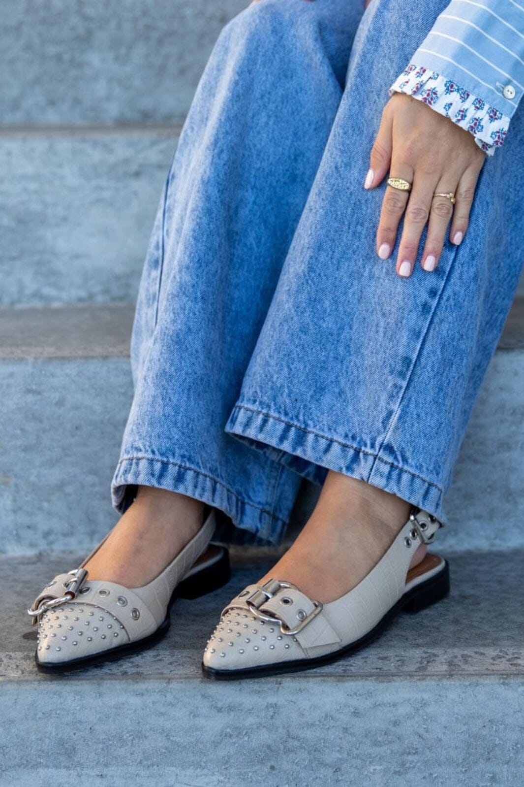 Beige leren schoenen met spitse neus en studs van Copenhagen Shoes. De schoenen hebben een zilverkleurige gesp-sluiting en een lage hak, waardoor ze praktisch zijn voor dagelijks gebruik.