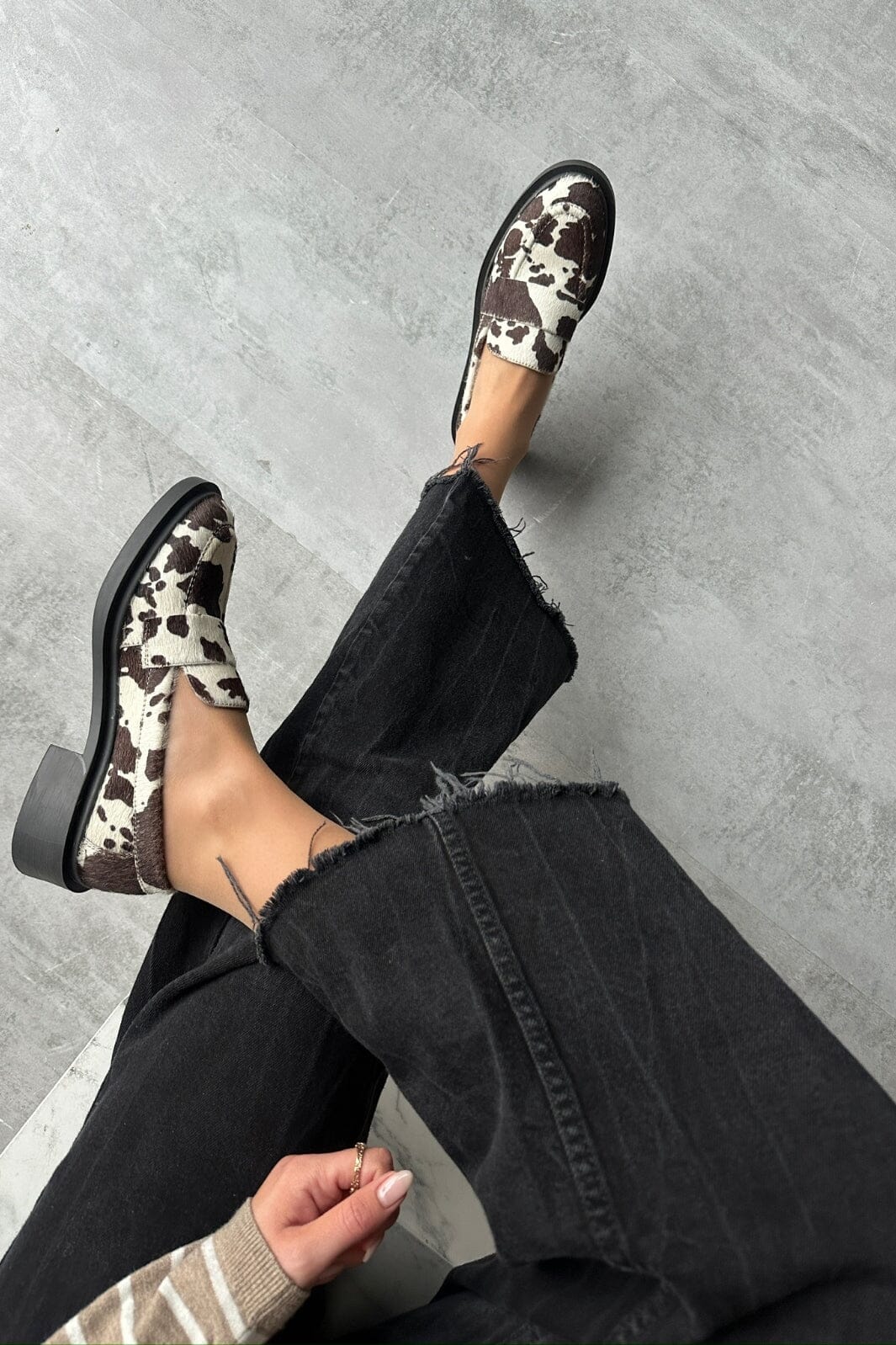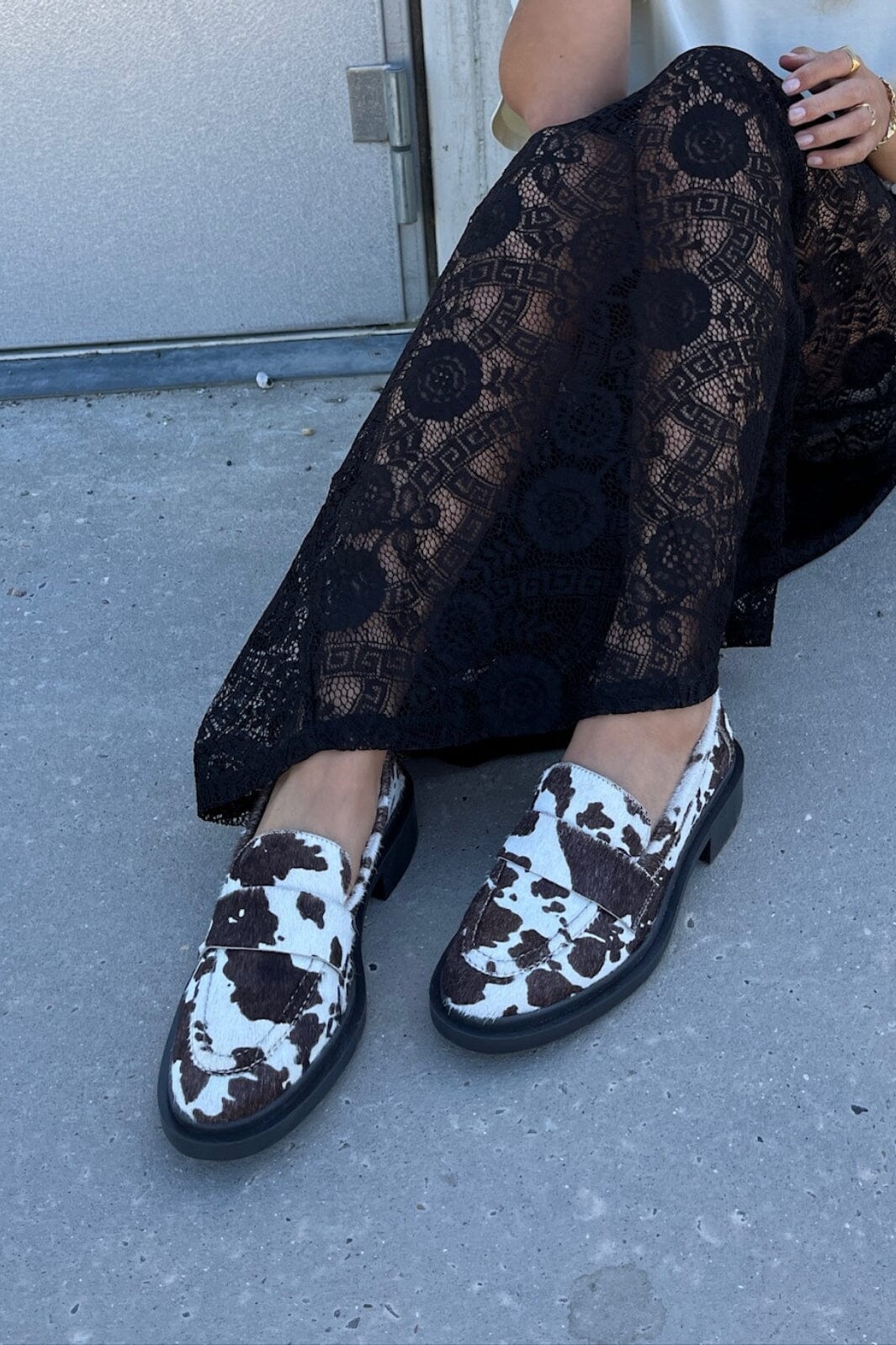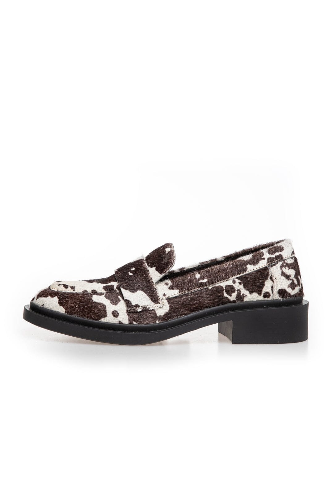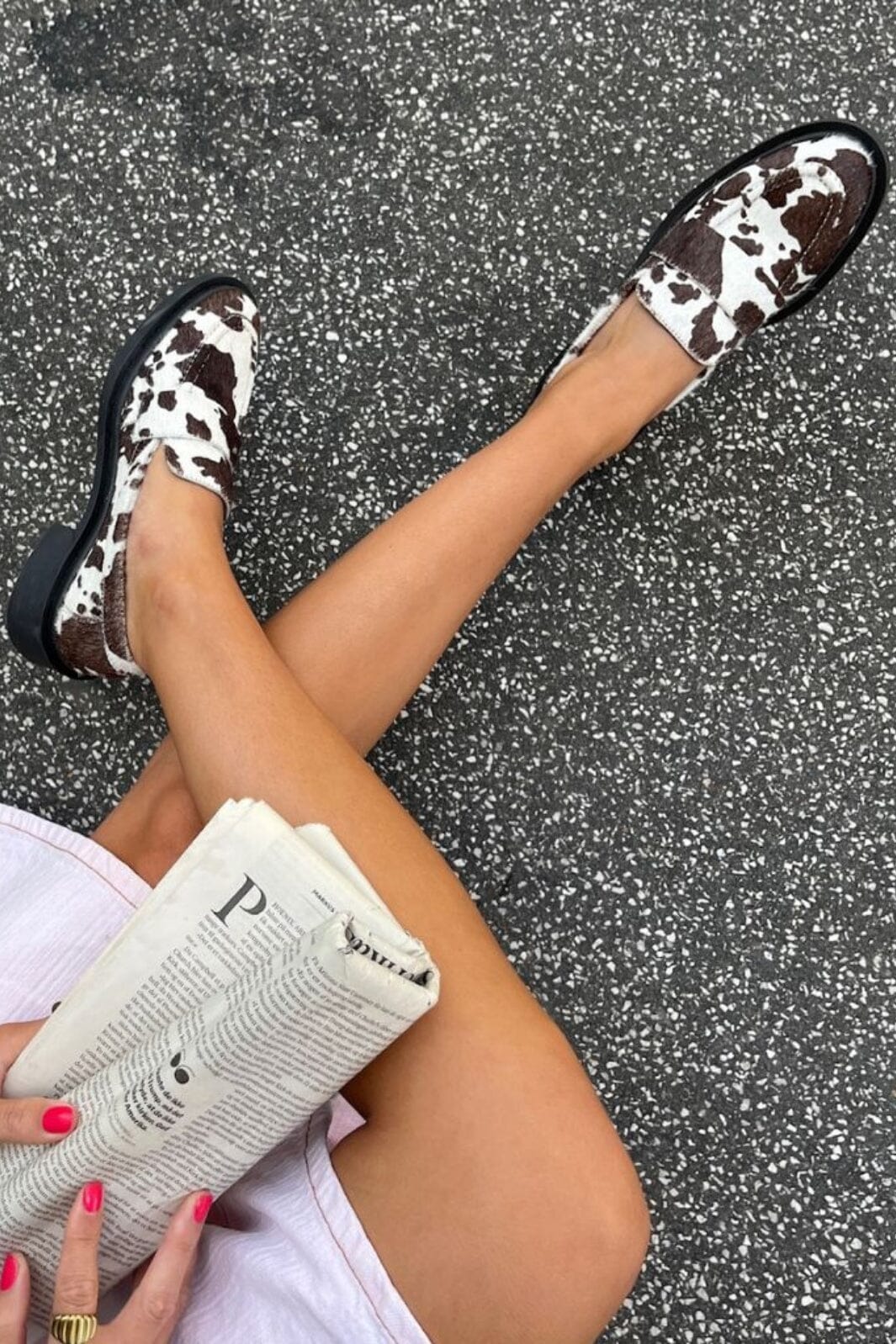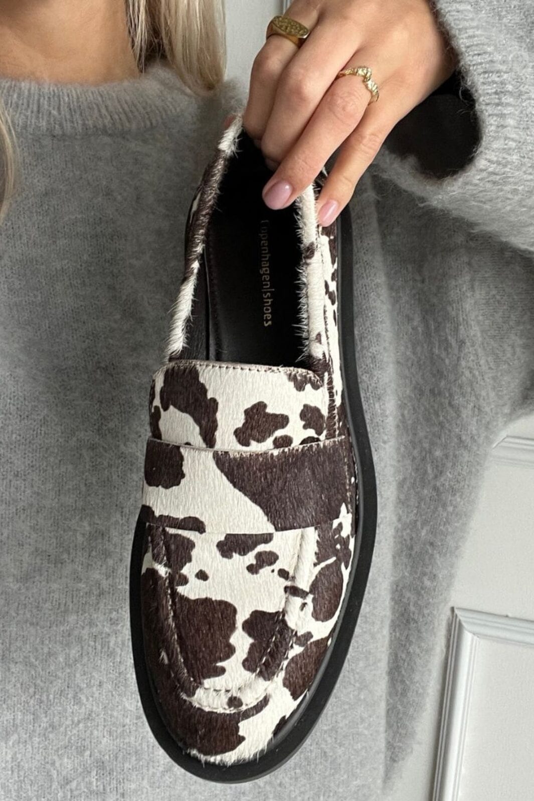 Loafer van Copenhagen Shoes in wit en bruin. De schoen is gemaakt van hair-on leer met koe-print en heeft een flexibele TPR-zool die goede ondersteuning biedt aan de voet.