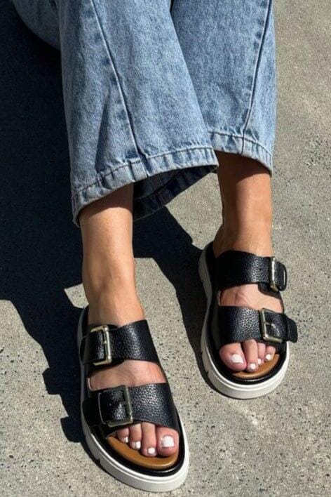 Zwarte sandalen van Copenhagen Shoes van leer met een opvallende platformzool. De twee verstelbare gespen en de stevige zool geven de sandalen hun kenmerkende uitstraling.