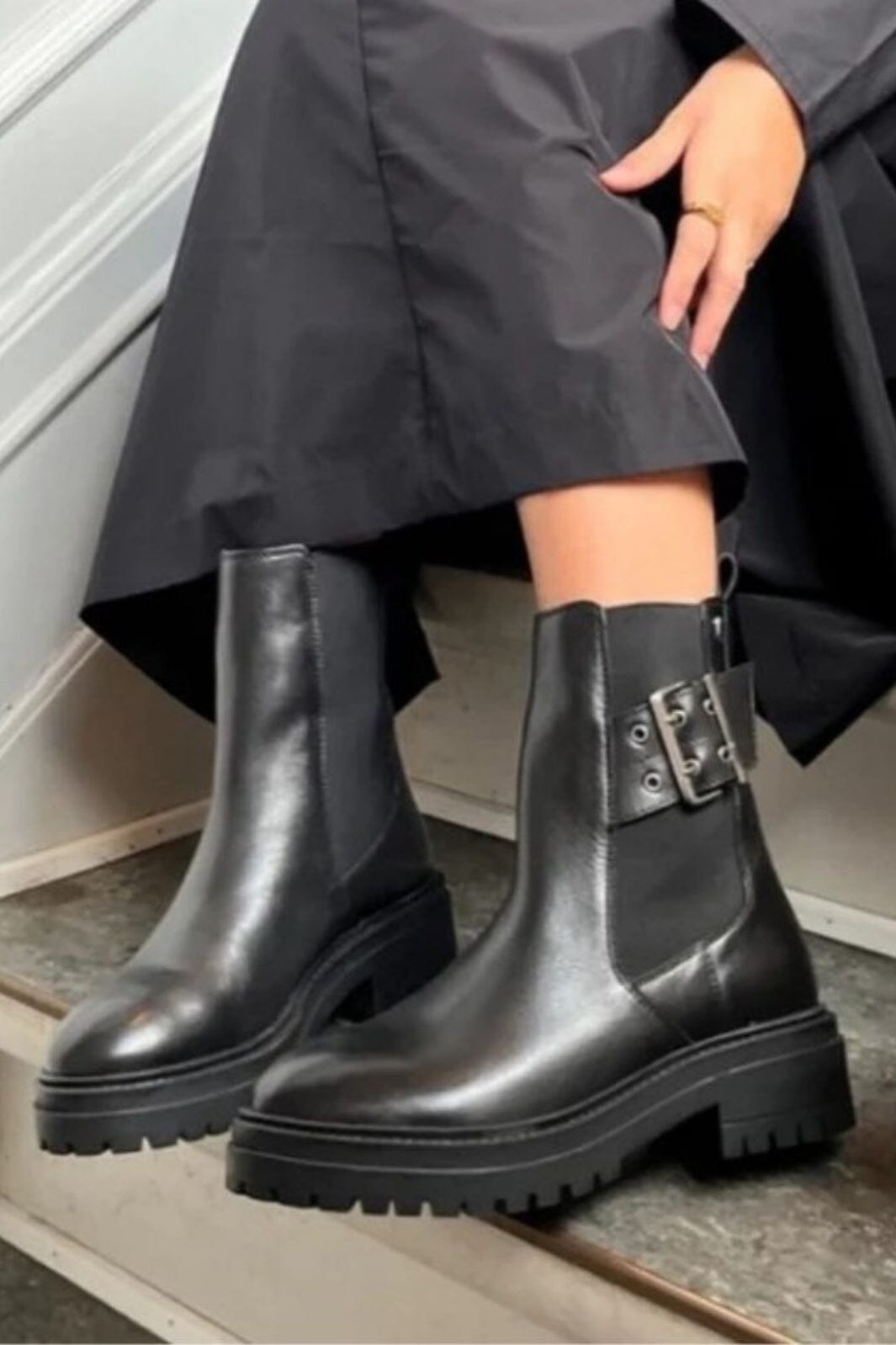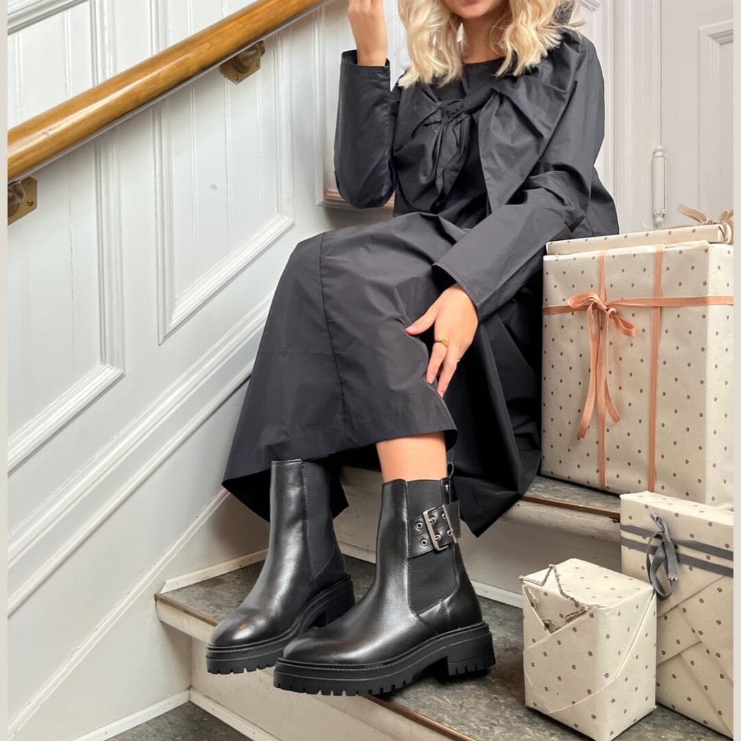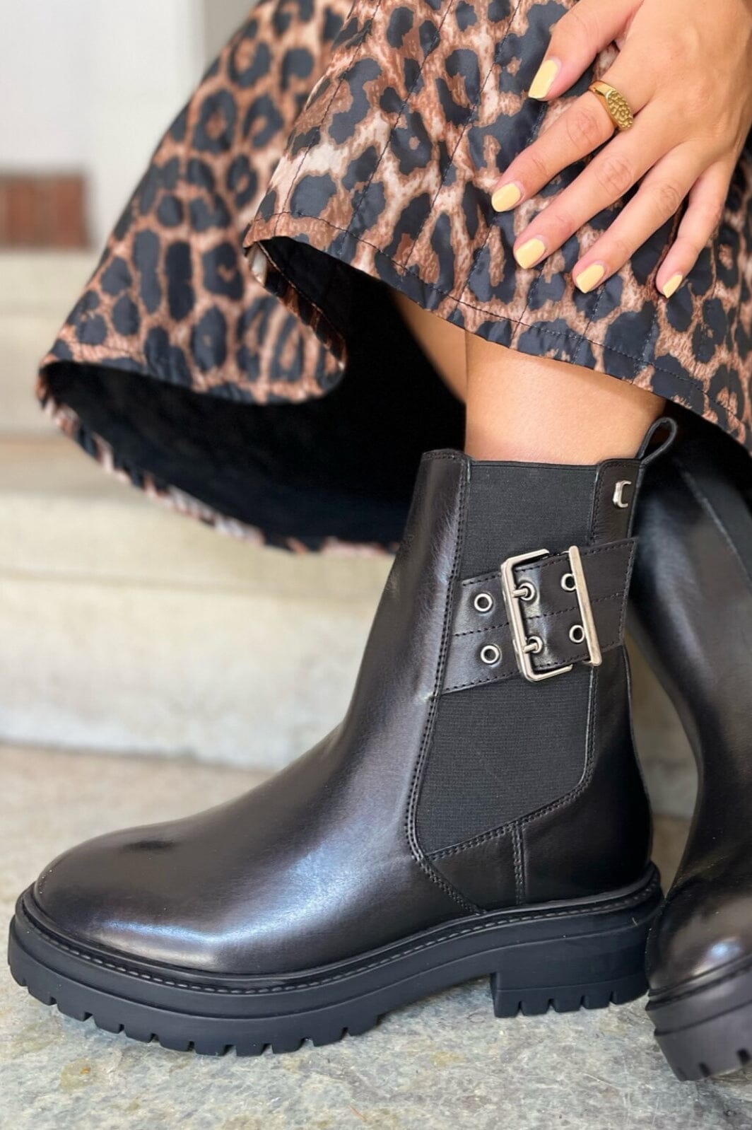 Zwarte laarzen van Copenhagen Shoes van leer met blokhakken. De laars heeft elastiek aan de zijkanten en een gesp als detail.