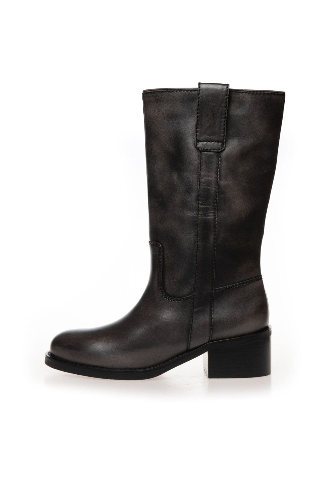 Beige en zwarte laarzen van Copenhagen Shoes in leer met een middelhoge blokhak. De laarzen hebben een ronde neus en een handige slip-on model zonder sluiting.