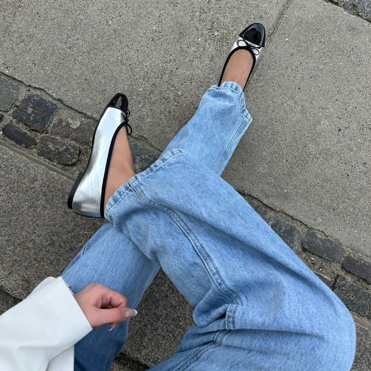 Ballerina's van zilver metallic leer met zwarte gelakte neus. De schoenen hebben een Tunit-zool en zijn geproduceerd met duurzame productie, gecertificeerd door de Leather Working Group.