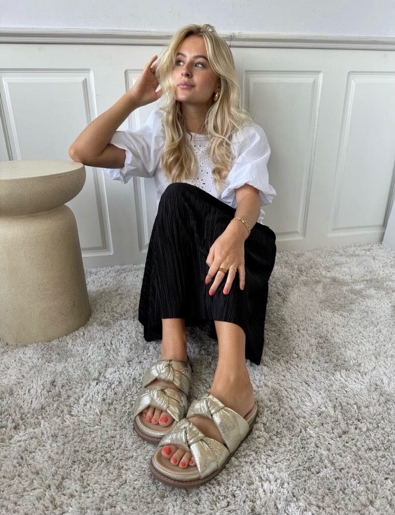 Sandalen van Copenhagen Shoes van leer met een metallic gouden/beige afwerking. De gedraaide banden geven de sandalen een uniek karakter, en de platte zool zorgt voor goede stabiliteit.