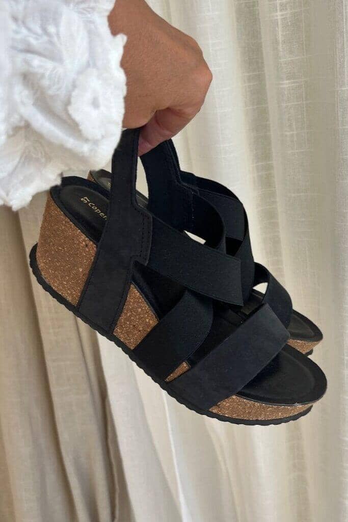 Zwarte sandaal van Copenhagen Shoes met kruisende bandjes van nubuck en elastiek. De sandaal heeft een kurken zool en een speciaal ontwikkelde schuimzool die goede ondersteuning biedt aan de voet.