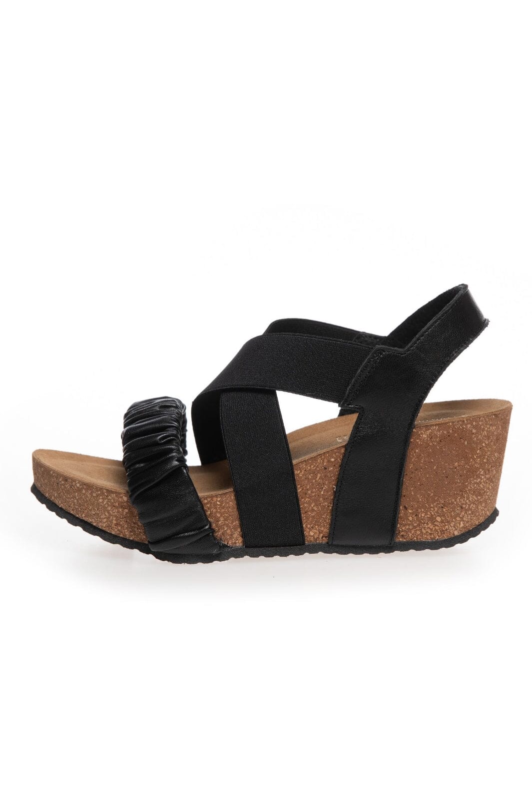 Zwarte sandalen van Copenhagen Shoes met gekruiste bandjes en een kurkachtige zool. De sandalen combineren suède en leer met een sleehak die goede ondersteuning biedt.