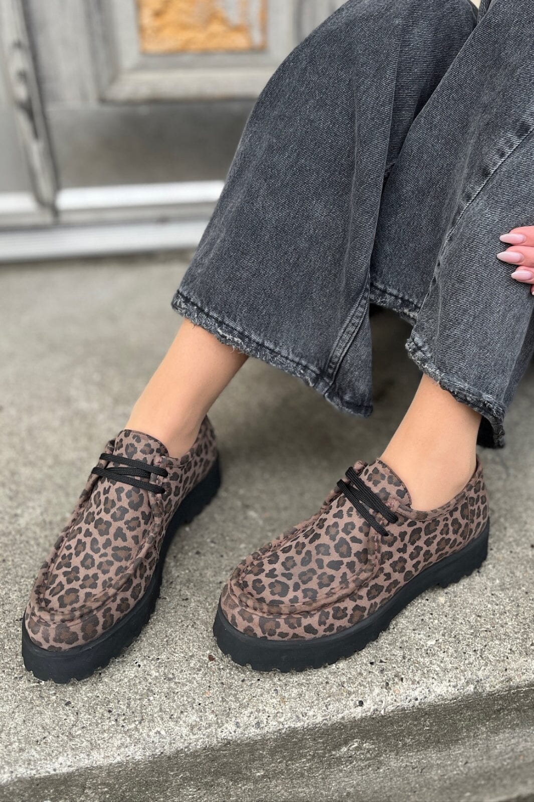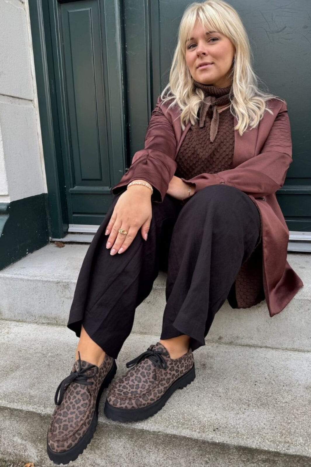 Sneakers van Copenhagen Shoes in suède met bruin luipaardpatroon. De schoenen hebben zwarte veters en een zwarte EVA-zool met goede flexibiliteit.