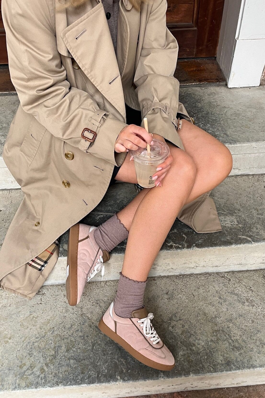 Roze sneakers van Copenhagen Shoes, gemaakt van zacht suède met witte veters en een bruine zool. Decoratieve stiksels aan de zijkant.