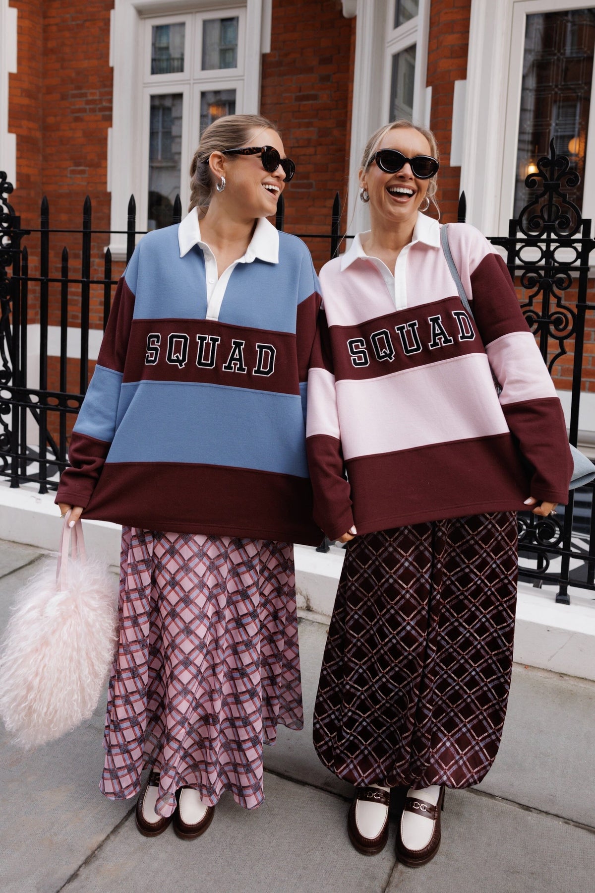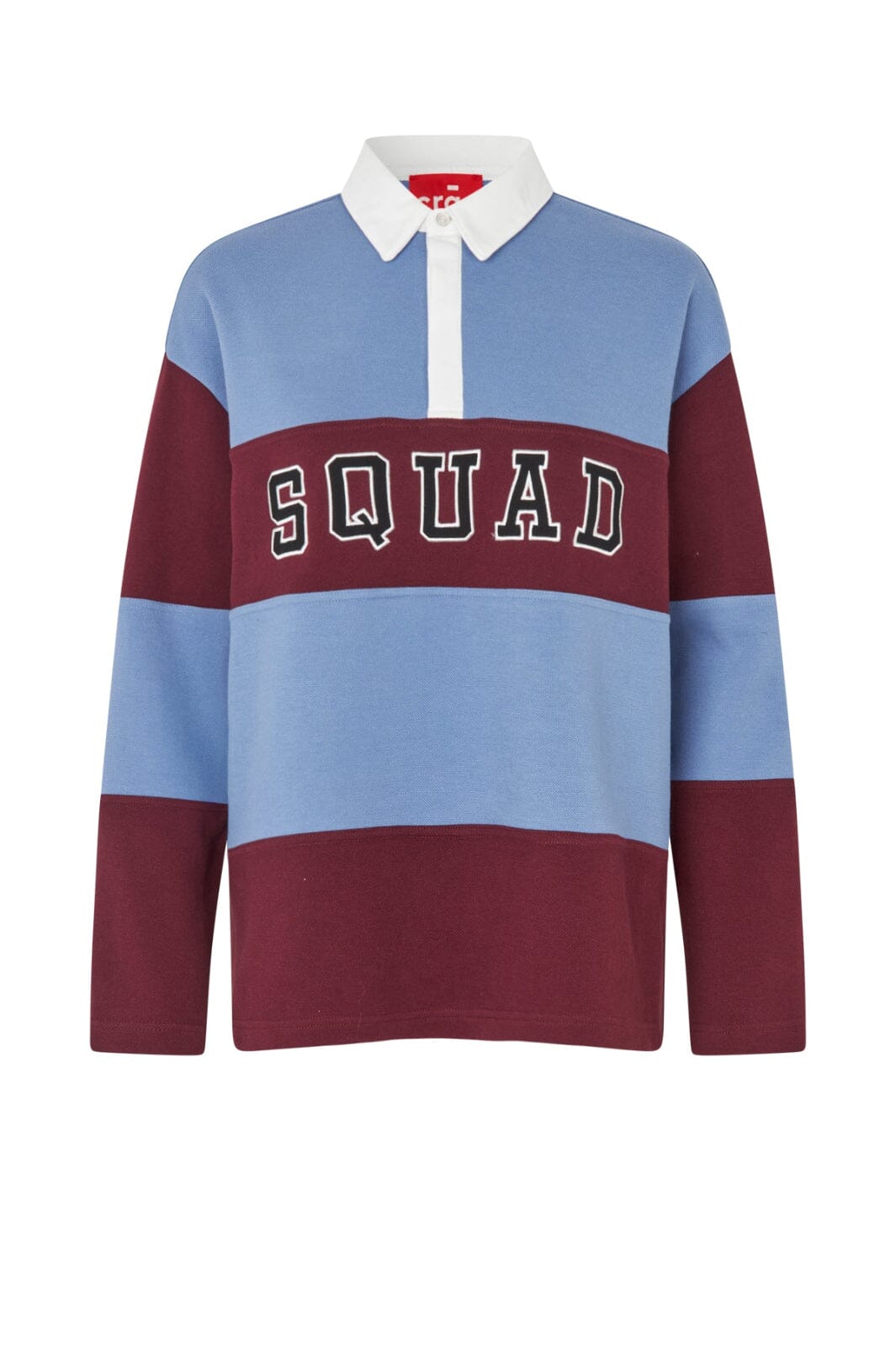 Polo-blouse van Cras met kleurvlakken in lichtblauw en bordeaux. De blouse heeft een SQUAD-print op de borst en een klassieke polokraag.