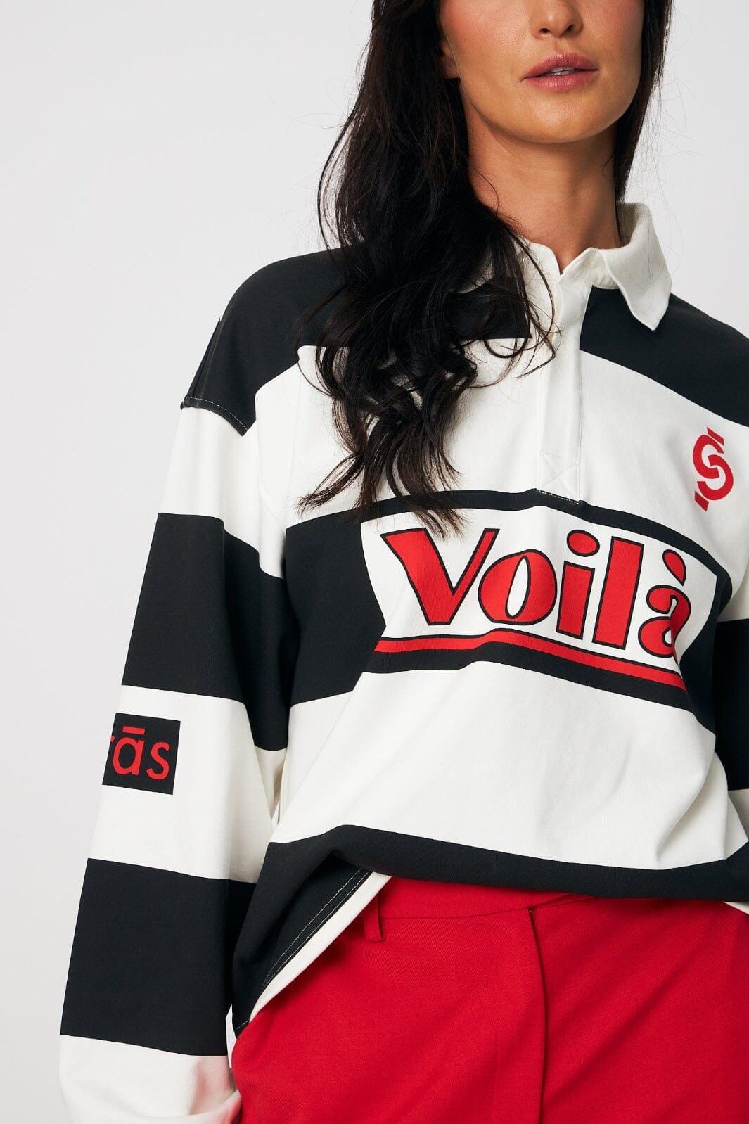 Zwarte en ivoorkleurige blouse van Cras met strepen en grafische Voilà-print in rood. De blouse heeft een oversized pasvorm met polokraag en lange mouwen.