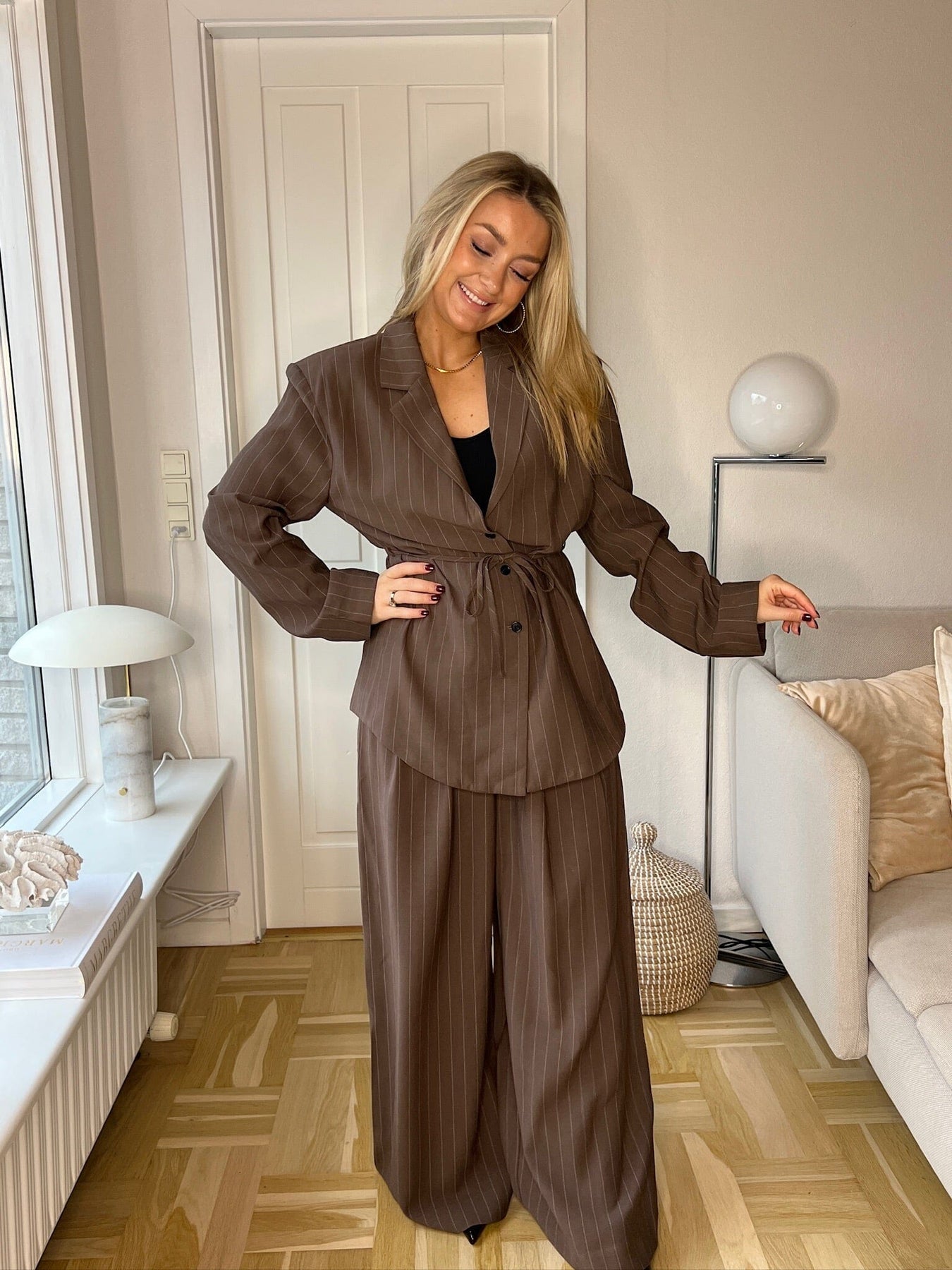 Bruine broek van Dear Molly met strepenpatroon. De broek is gemaakt van geweven materiaal en heeft een vloerlang model met een hoge taille en strikceintuur.