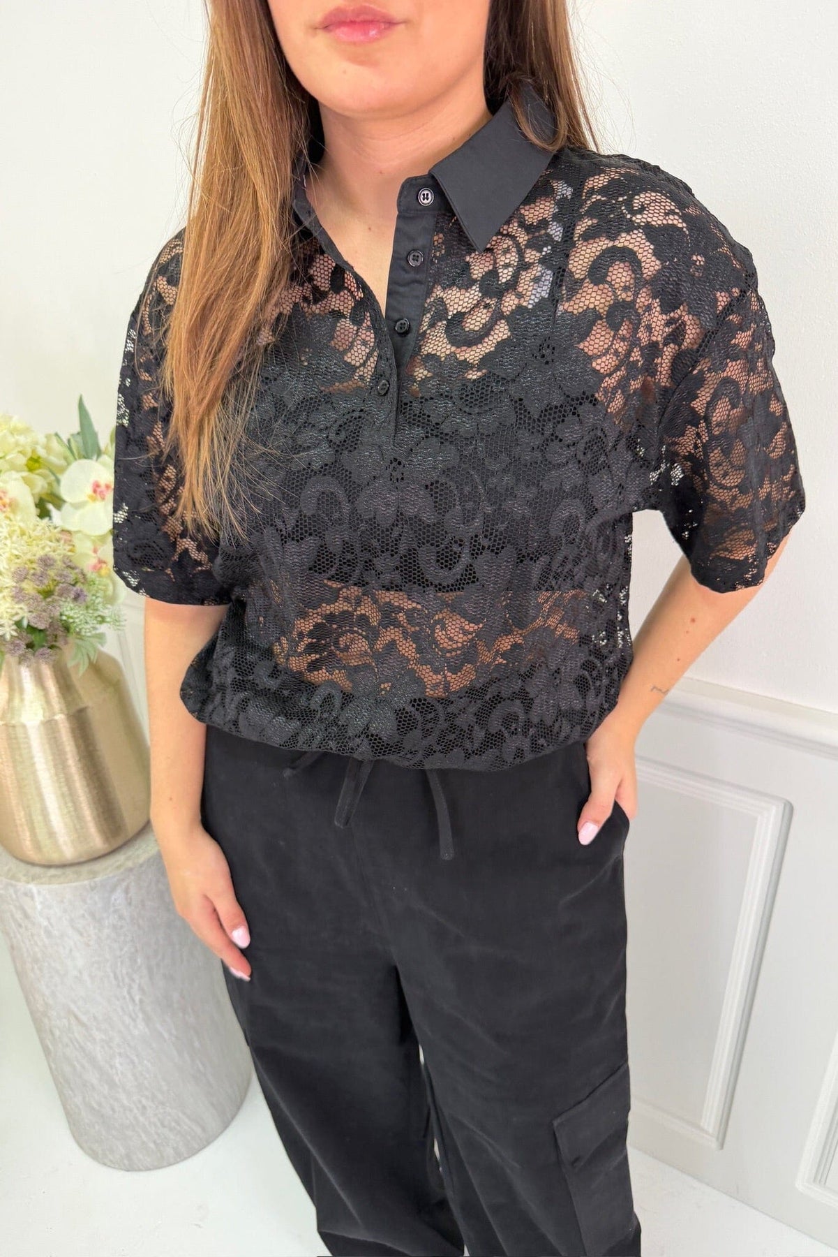 Zwart poloshirt van Dear Molly met borduursel en kanten details. Het shirt heeft korte mouwen en een knoopsluiting bij de kraag.