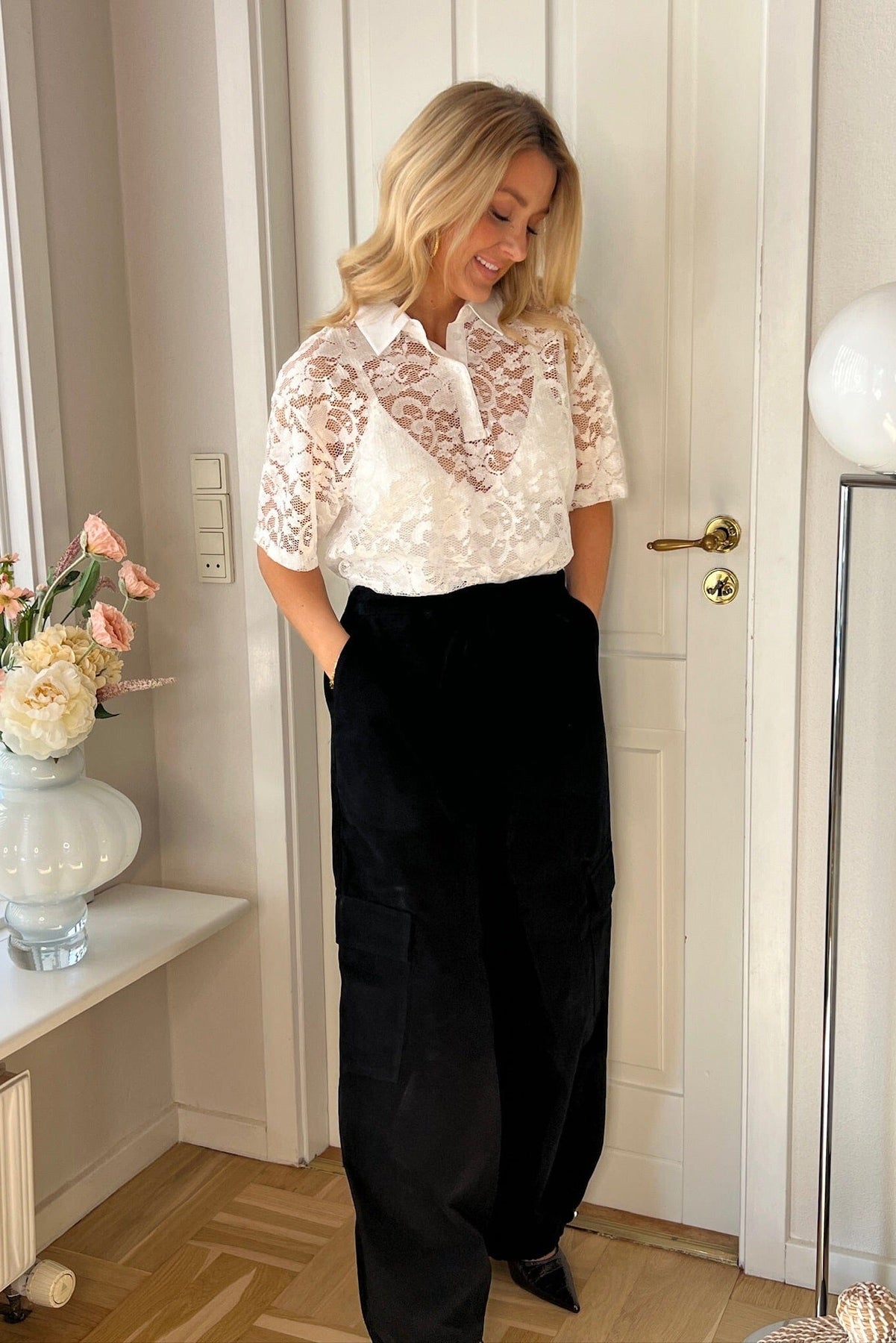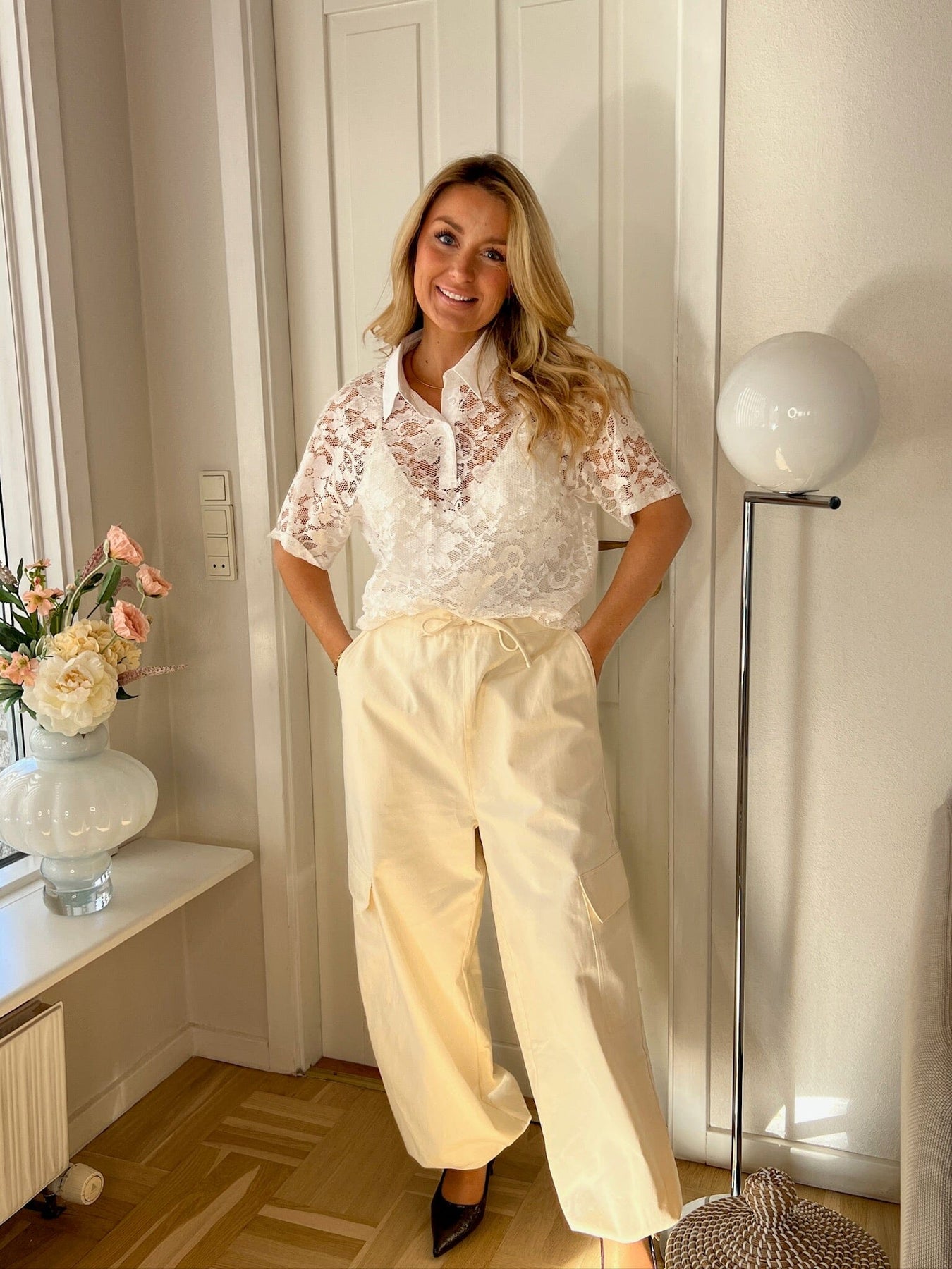 Wit poloshirt van Dear Molly met borduursel in een bloemmotief. Het shirt heeft kant en knopen aan de voorkant en is geschikt voor zowel alledaagse als feestelijke gelegenheden.