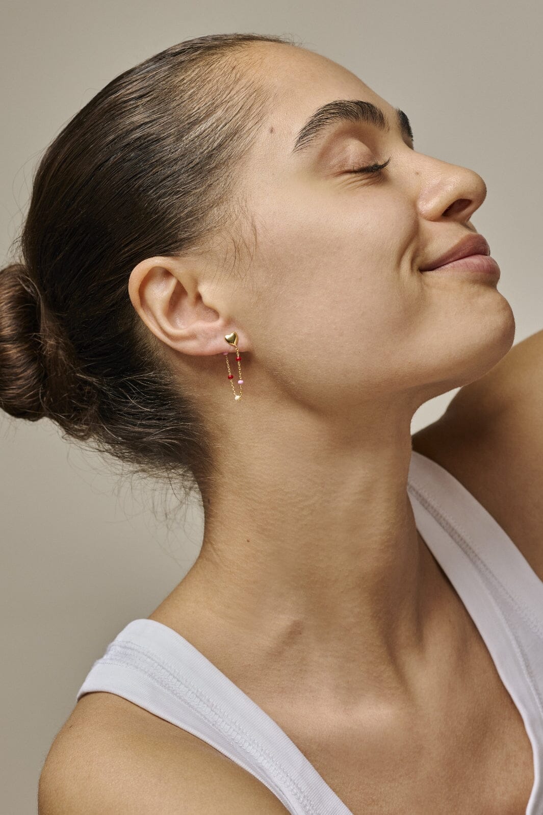 Oorbellen van Enamel Copenhagen met een hartvormige steker in verguld zilver. Een ketting met rode, roze en witte kralen hangt onder het hart.