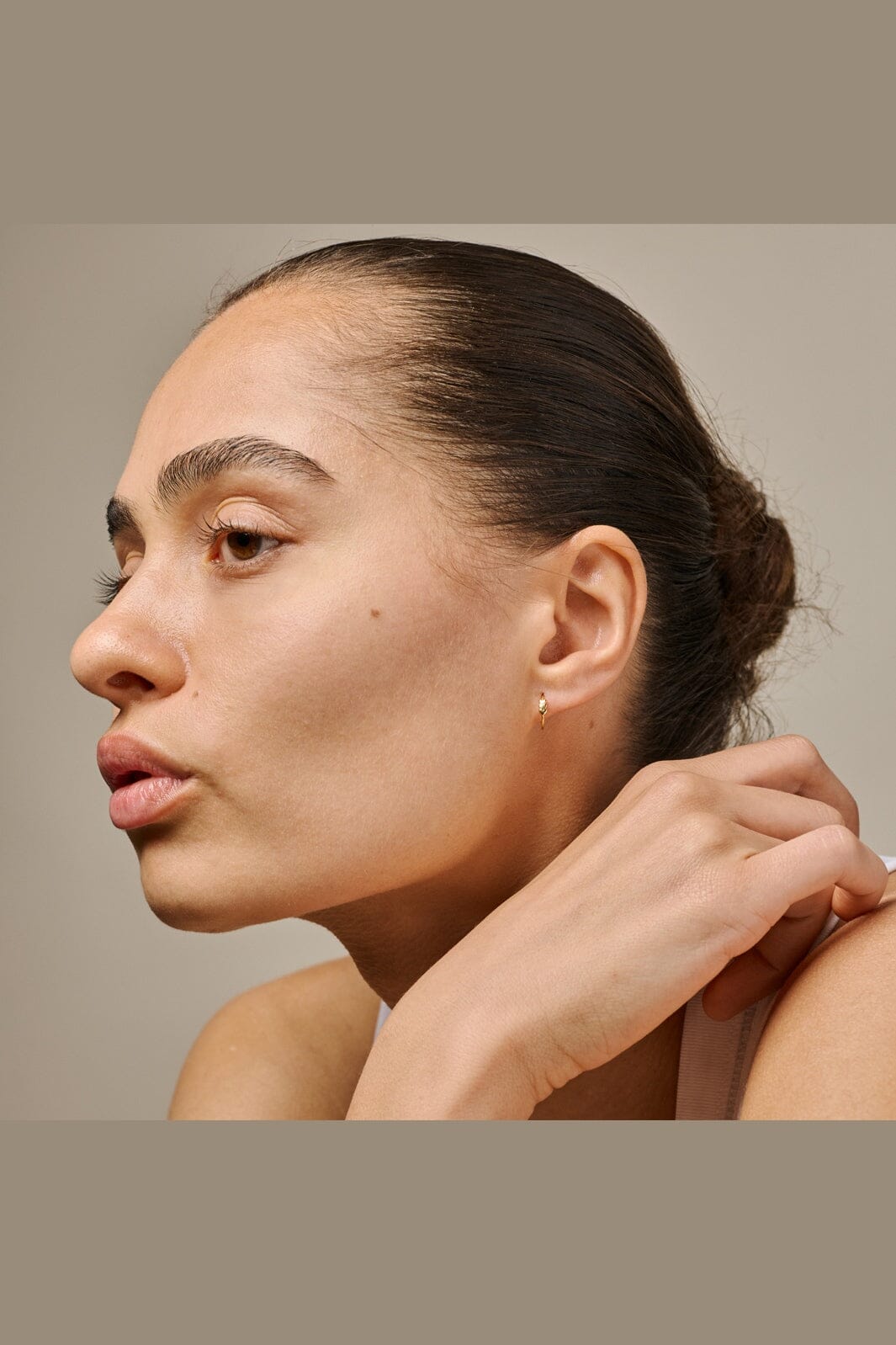 Goudkleurige oorbellen van Enamel Copenhagen met drie kleine hartjes aan de voorkant. De oorbellen hebben een dunne en lichte twist-vorm met een handige draaisluiting.