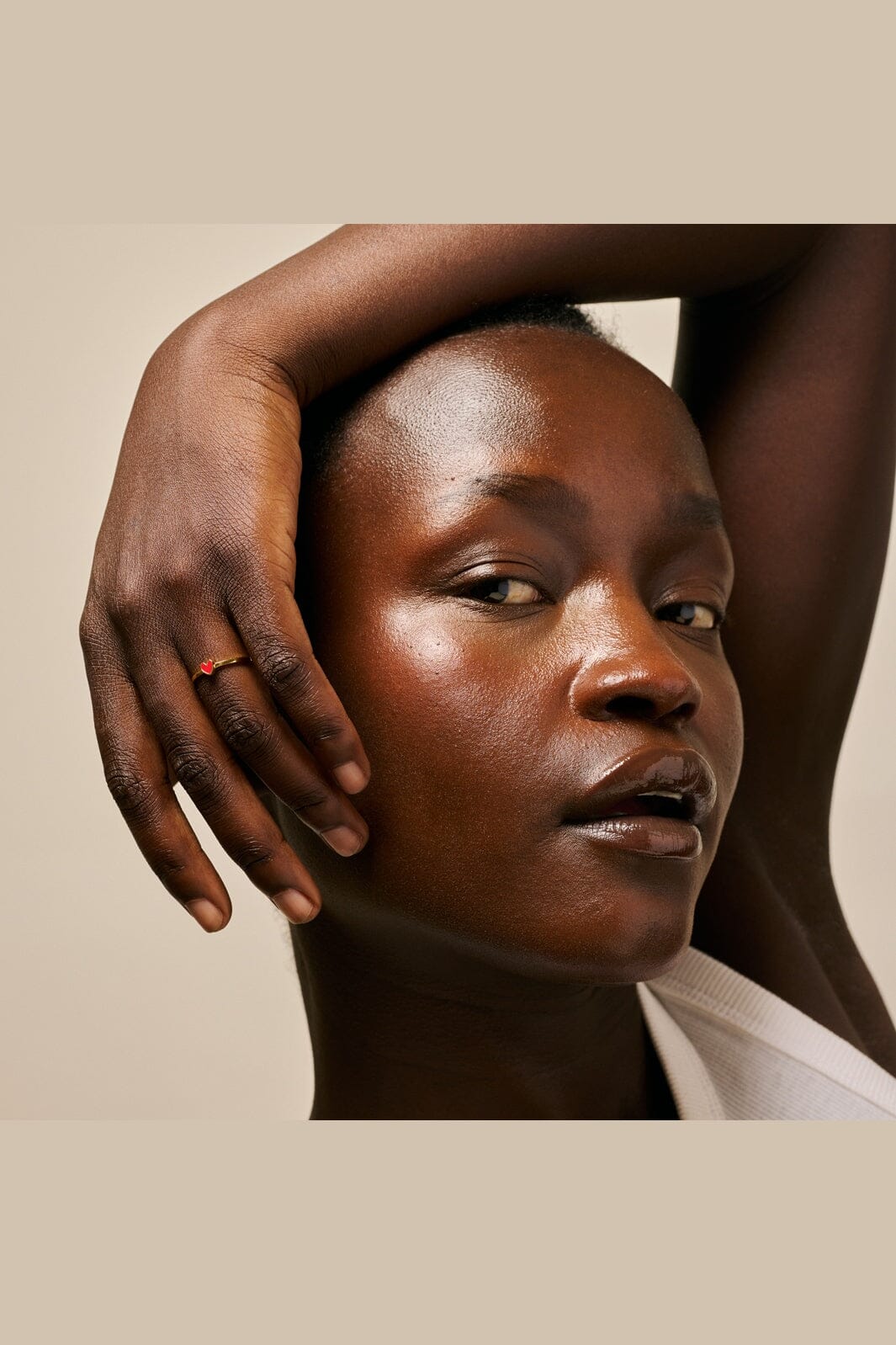 Ring van Enamel Copenhagen met een rood hartvormig design. Hij is gemaakt van gerecycled sterling zilver met een 18K goudlaagje en heeft een open ringvorm met een dun, licht profiel.