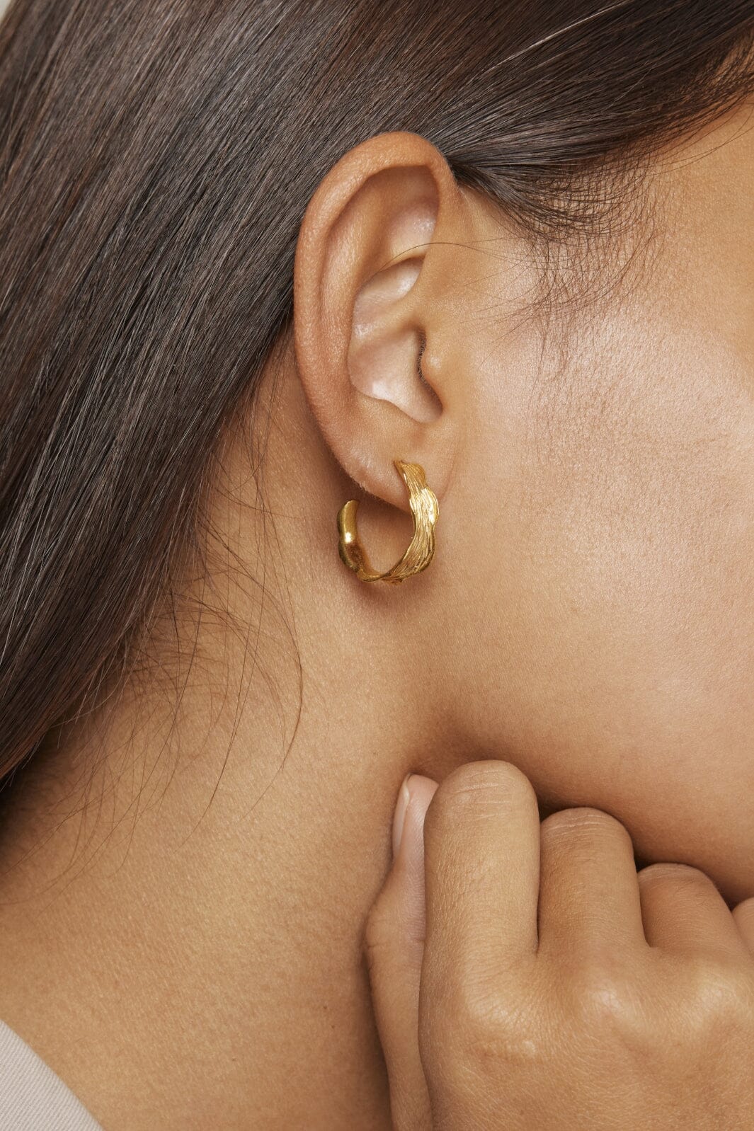 Handgemaakte hoops-oorbellen van Enamel Copenhagen met een golvende vorm. Ze hebben een gestructureerd oppervlak en zijn gemaakt van gerecycled sterling zilver met een gouden coating.