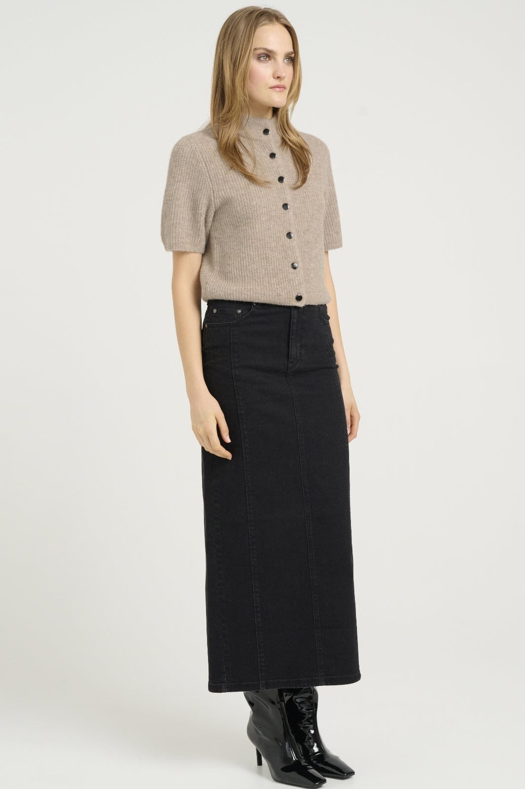Korte cardigan van Gestuz in warme zandkleurige melange. Hij heeft een hoge hals en korte mouwen met een rij zwarte knopen aan de voorkant. De brei heeft een zachte textuur en regular fit.