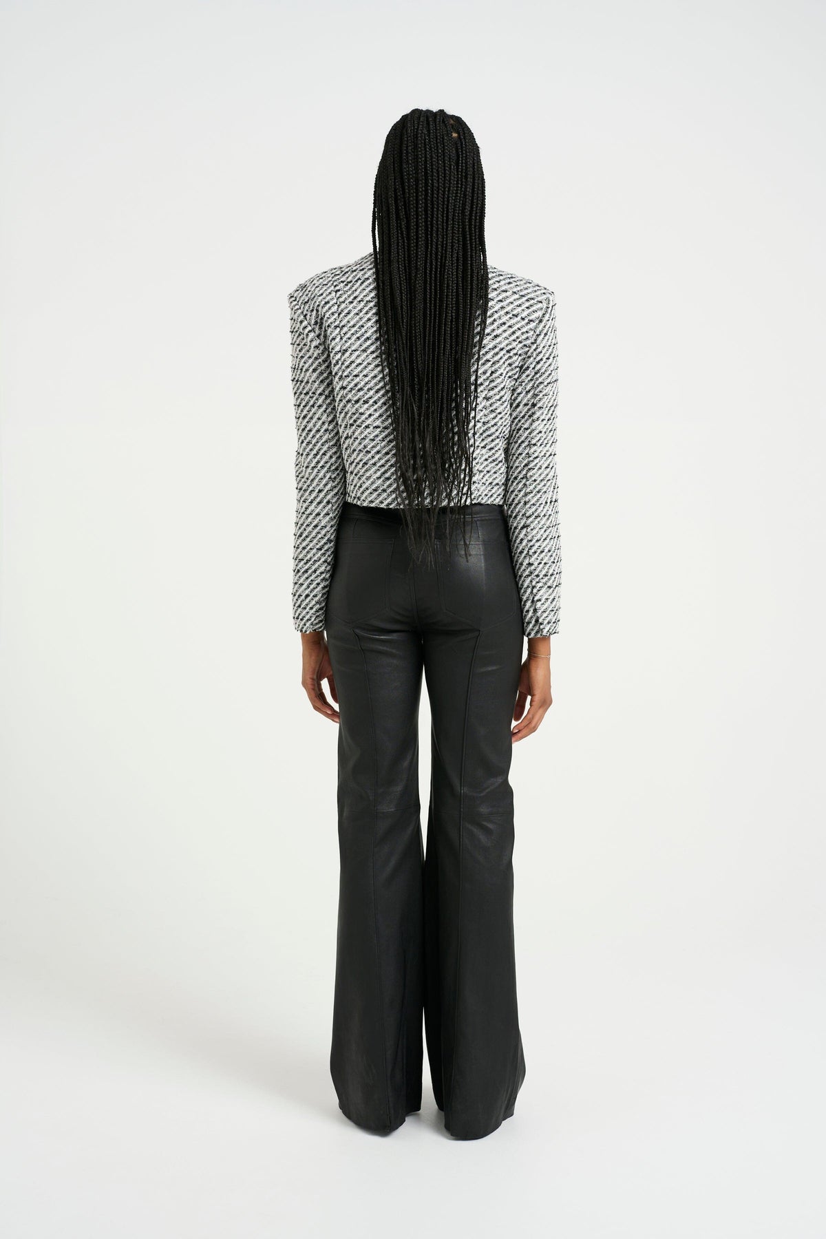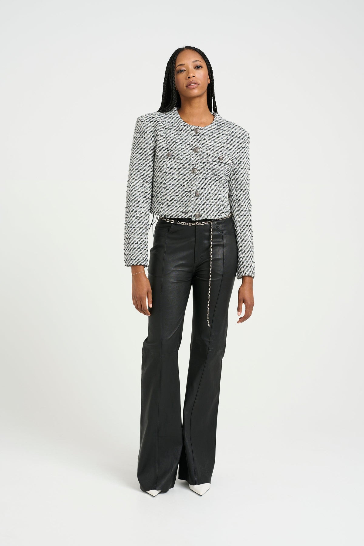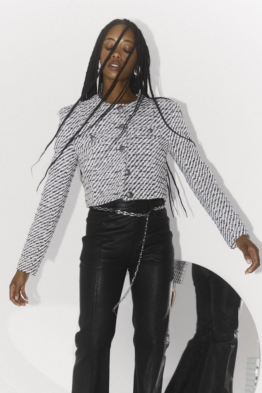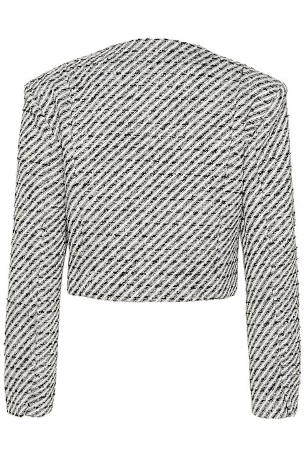 Zwart-witte cropped jas van Gestuz met gestructureerde schouders en lurex twill strepen. De jas heeft een korte lengte en knopen aan de voorkant.